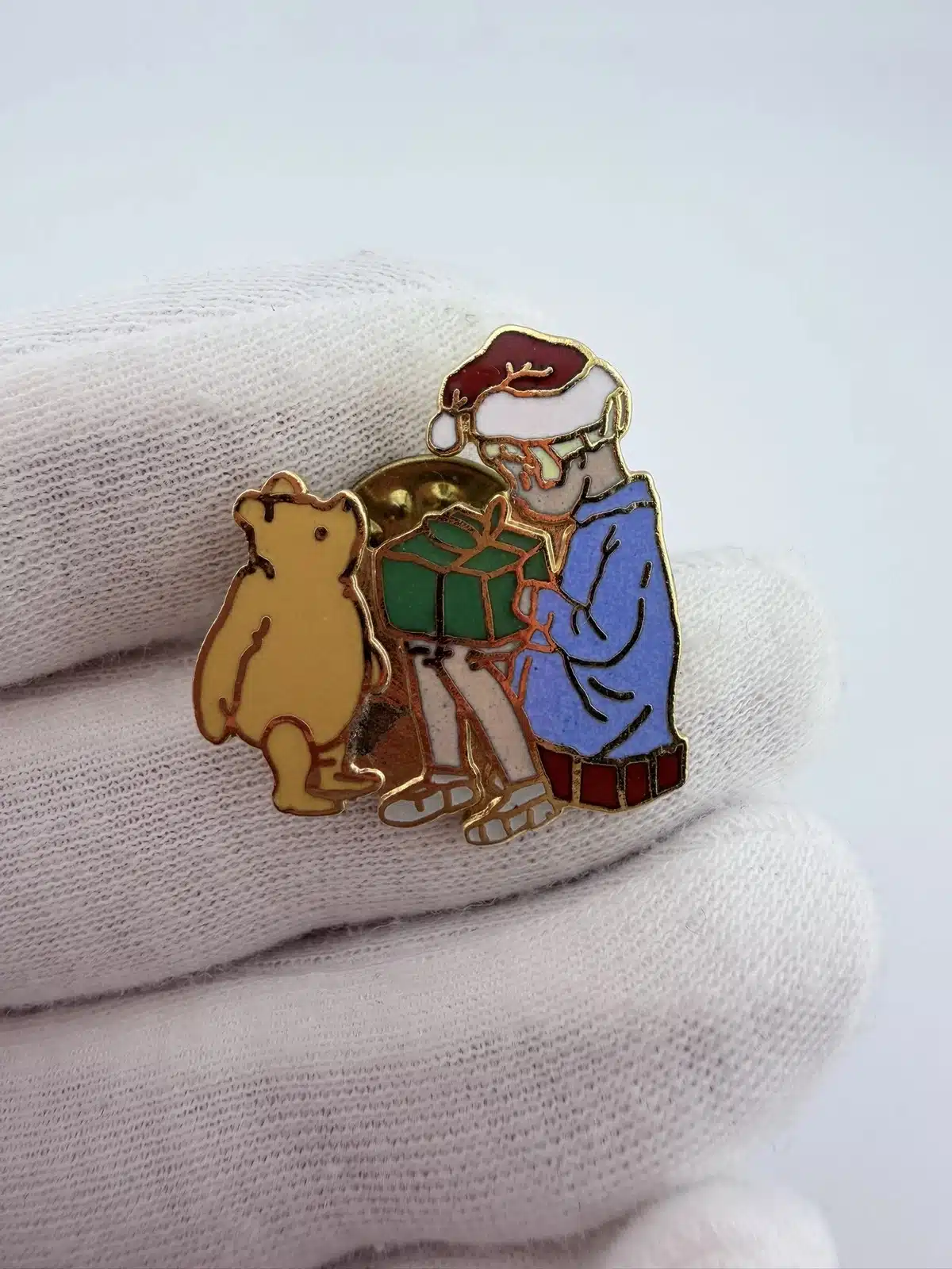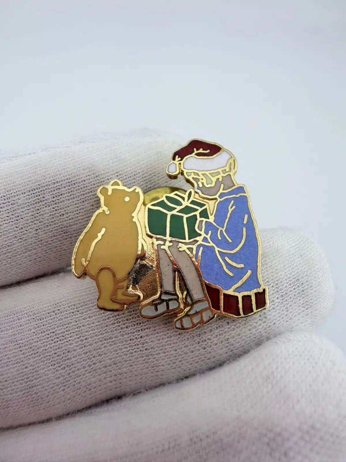 This vintage Disney Winnie the Pooh and Christopher Robin pin features a charming scene of Winnie the Pooh standing beside Christopher Robin as he opens a present while wearing a red and white Santa hat. The festive design captures the classic characters from A. A. Milne’s beloved stories as popularized by Disney adaptations.