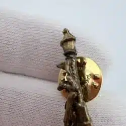 This pin features a small figure of a dog standing upright and leaning against a lamp post, holding what appears to be a cigar. The compact vertical design gives the scene a playful and slightly whimsical appearance.