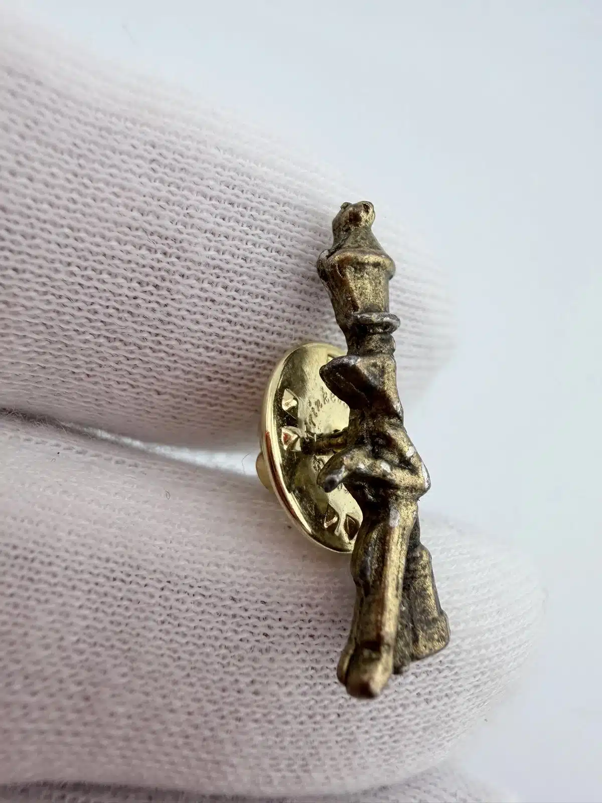 This pin features a small figure of a dog standing upright and leaning against a lamp post, holding what appears to be a cigar. The compact vertical design gives the scene a playful and slightly whimsical appearance.