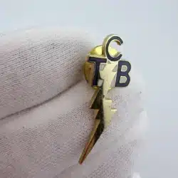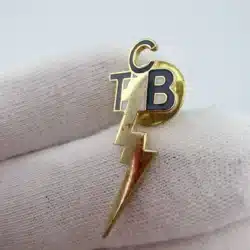 This pin features the letters TCB at the top with a lightning bolt extending downward from the center of the design. The vertical layout emphasizes the bolt, creating a bold and recognizable emblem associated with the initials.