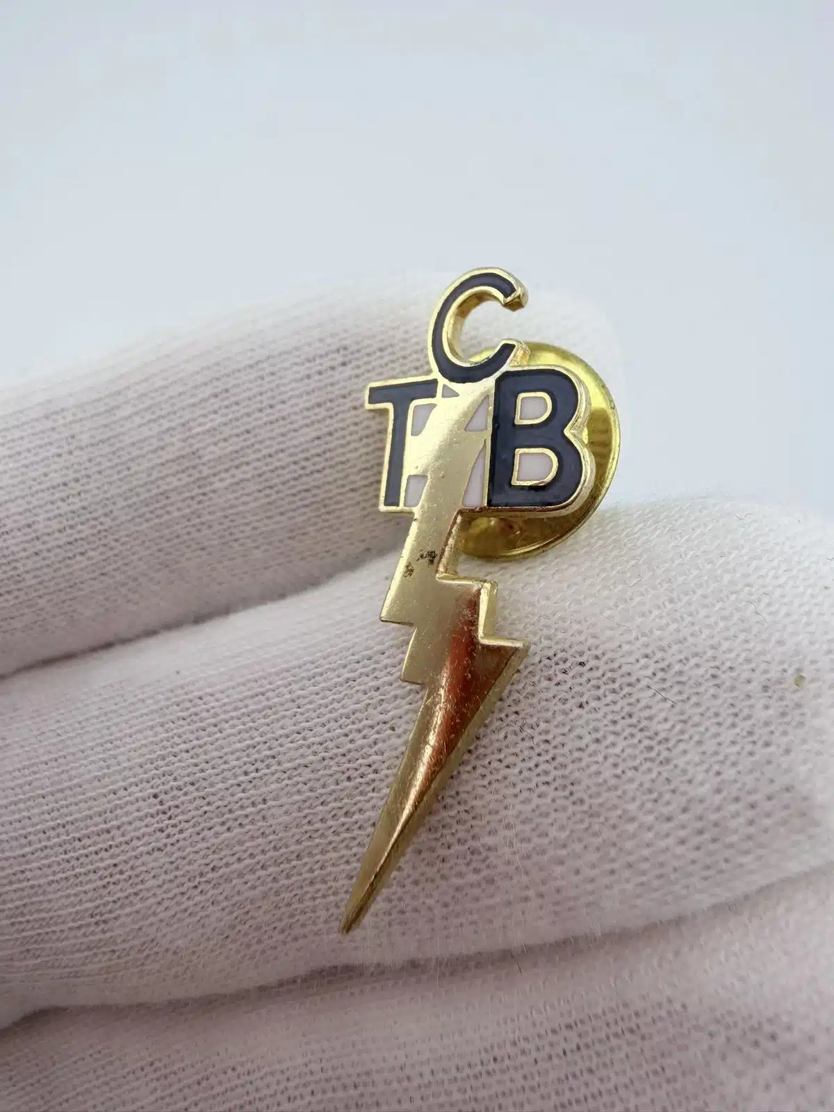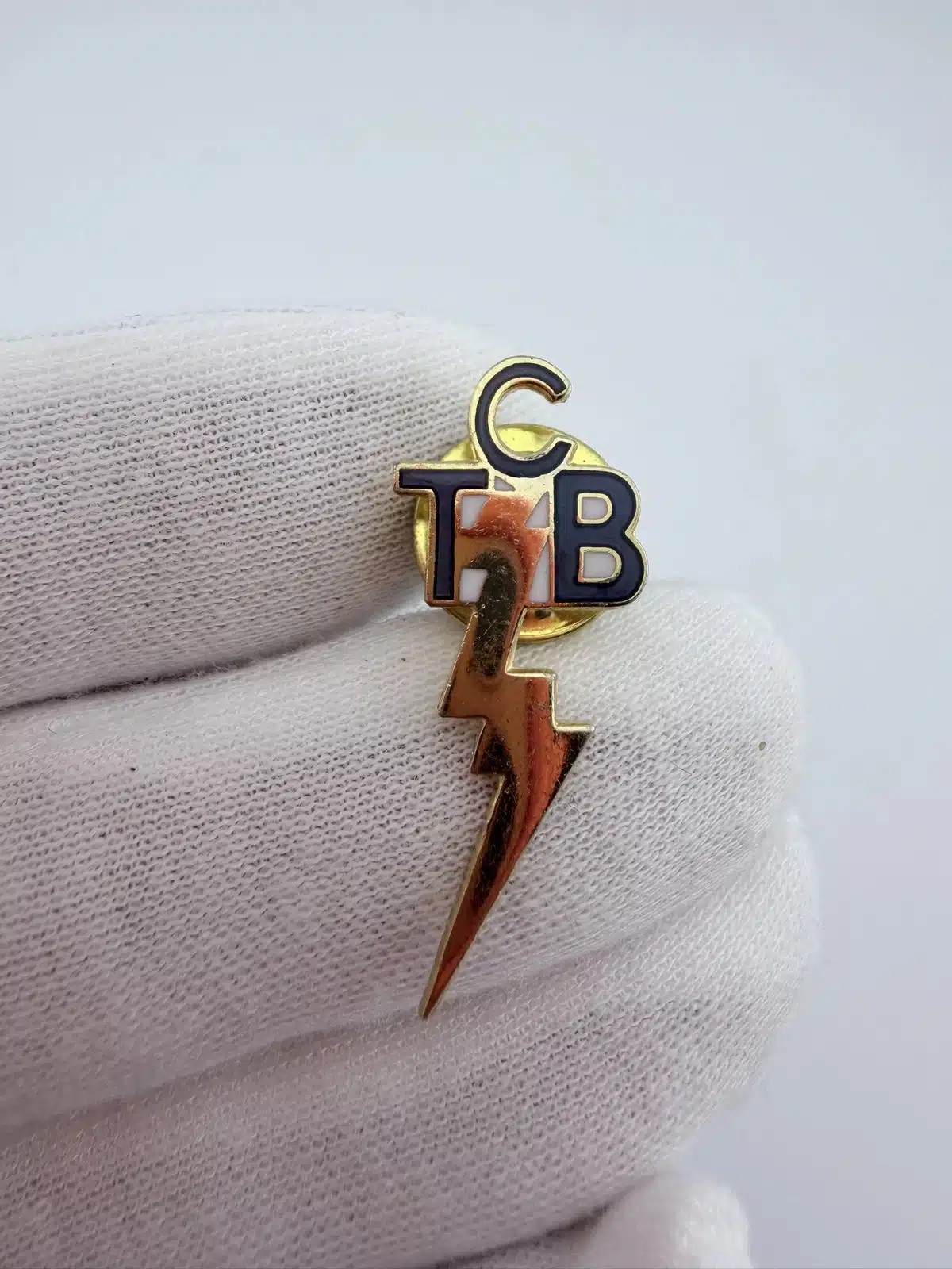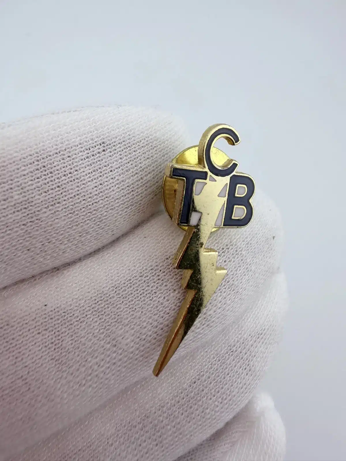 This pin features the letters TCB at the top with a lightning bolt extending downward from the center of the design. The vertical layout emphasizes the bolt, creating a bold and recognizable emblem associated with the initials.
