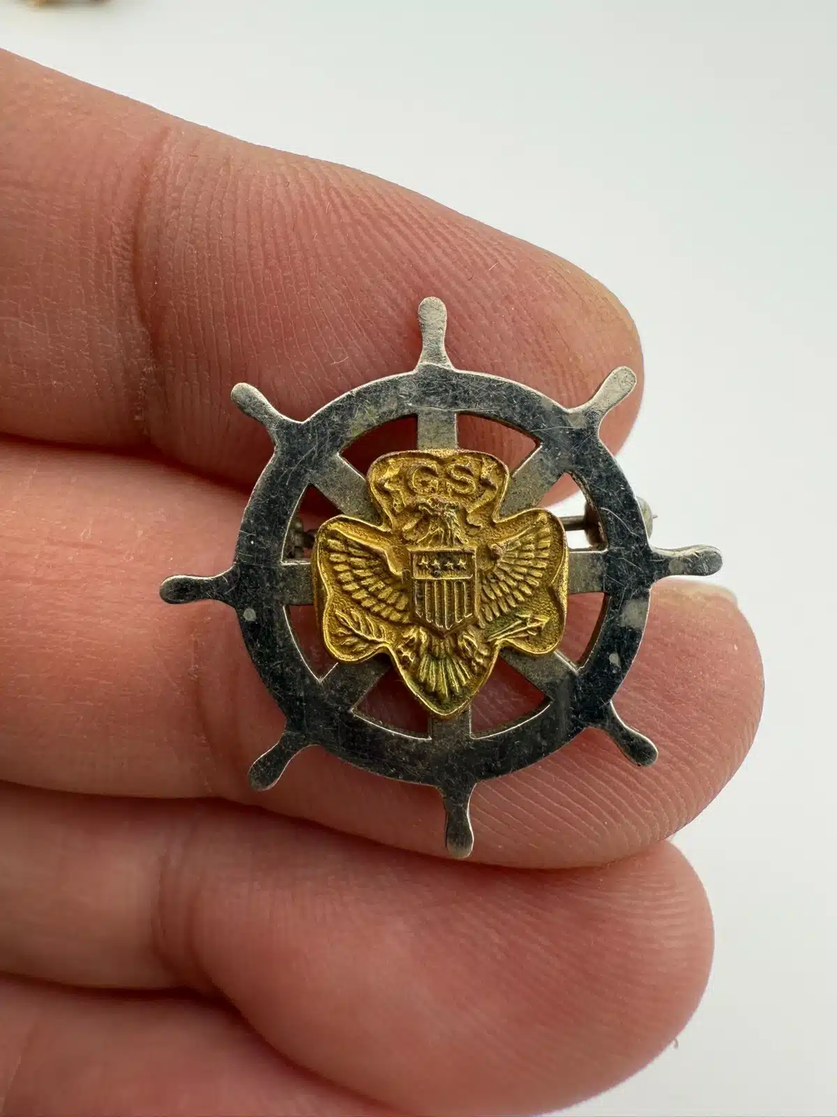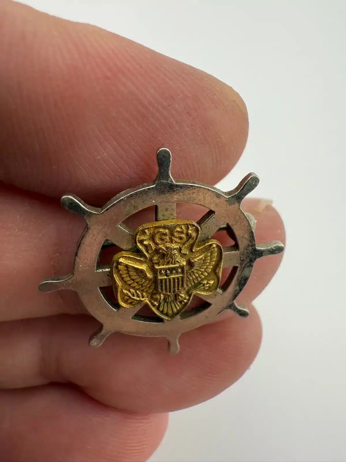 Vintage Girl Scout Mariner Membership Pin – Ship Captain’s Wheel – *scuff marks*
