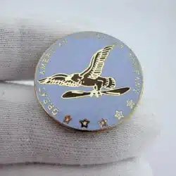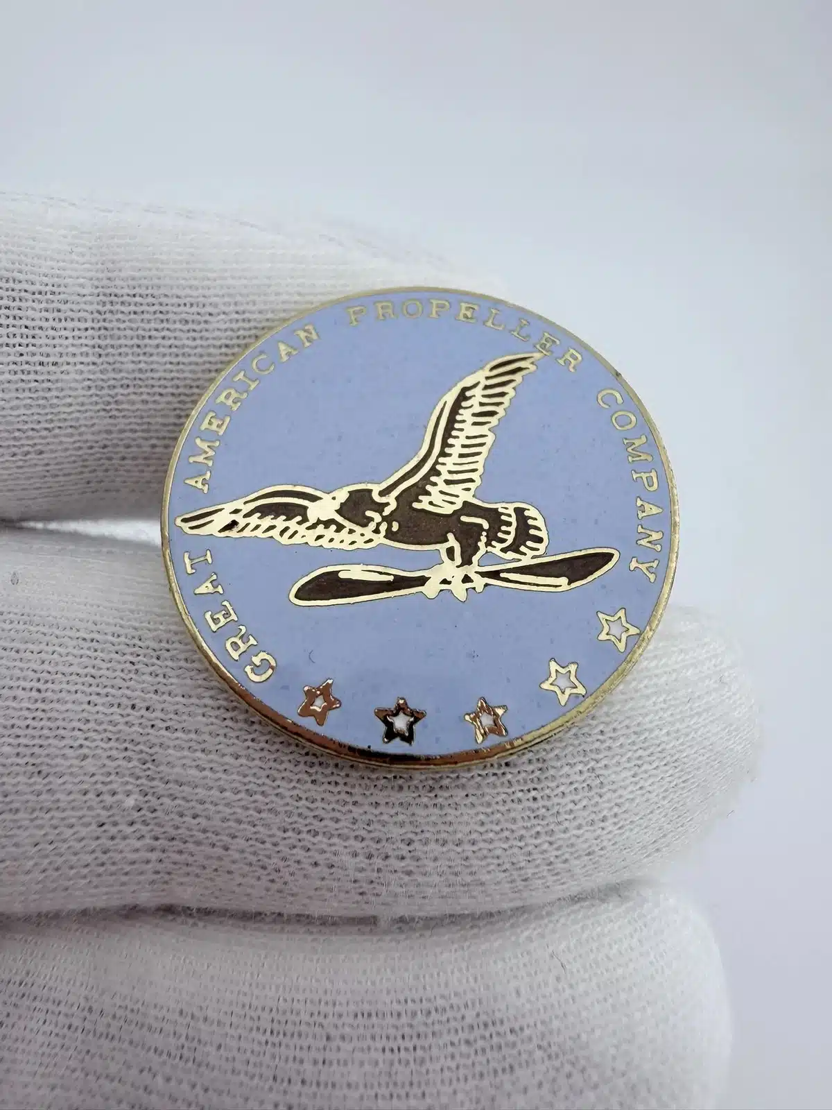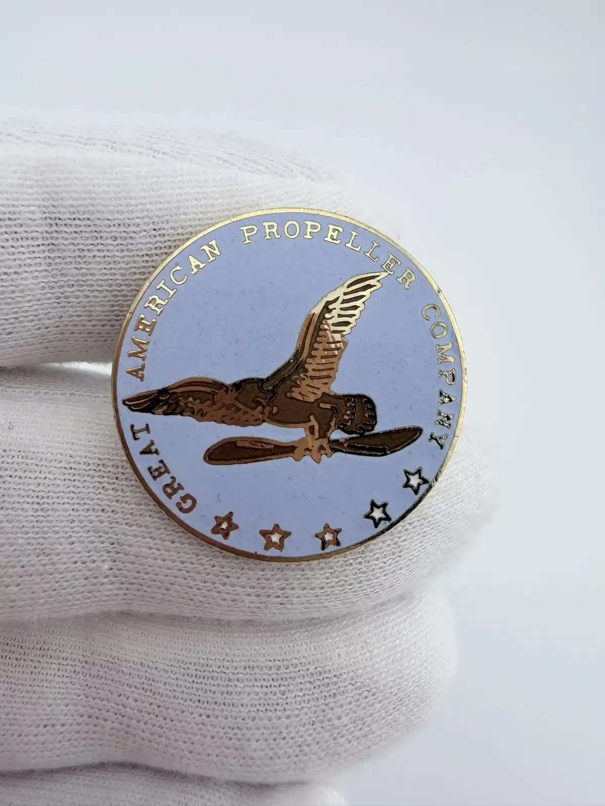 This vintage pin features a circular design with light blue enamel, prominently displaying ‘Vintage Great American Propeller Company’ around the inner top edge. At the center, an eagle carries a propeller, flanked by five white stars at the bottom, reflecting the proud aviation heritage associated with the company.