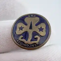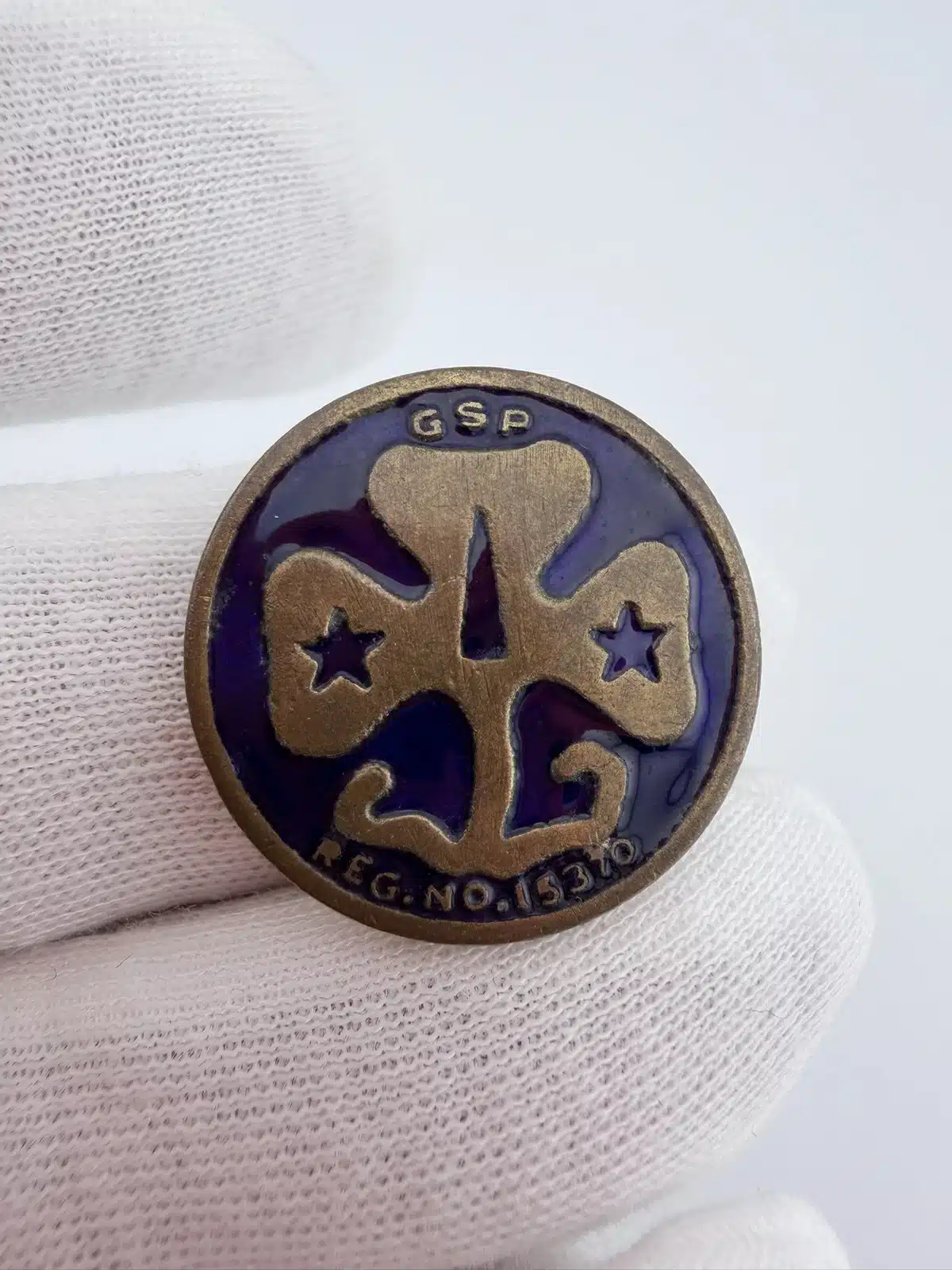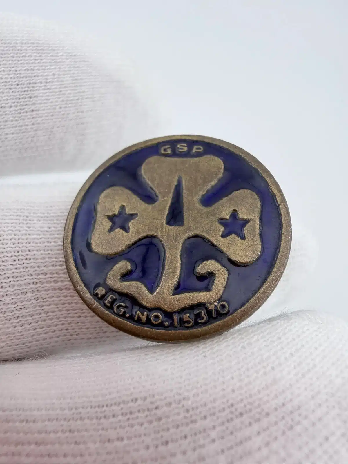 Beautiful and incredibly rare Girl Scouts pin, possibly from the Girl Scout of the Philippines. The front of the pin features the iconic Girl Scouts trefoil over purple enamel with the letters GSP above and Reg. No. 15370. below. The rear of the pin has an open style C clasp along with a design approval stamp.
