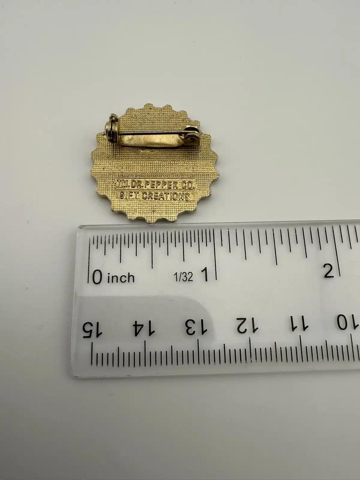 This vintage pin features an iconic Dr. Pepper bottle cap design, showcasing the brand’s distinctive red and white color scheme. The piece reflects the nostalgic appeal of the soft drink, which was first introduced in 1885 and has since become a significant part of American pop culture.