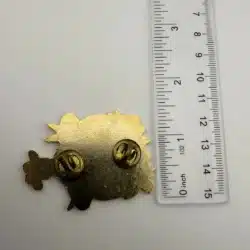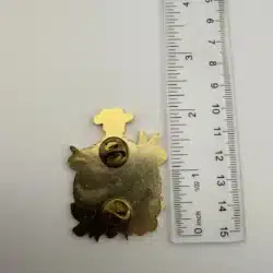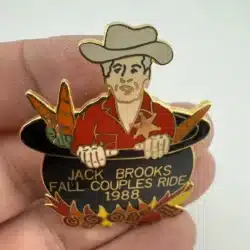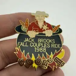 This dual-clasp pin reads “Jack Brooks Fall Couples Ride 1988” and features a whimsical illustration of a man, presumably Jack, wearing a cowboy hat and sheriff’s badge sitting in a stew pot filled with carrots over an open fire. The exact context is unclear, but it may be associated with a motorcycle ride or rally event.