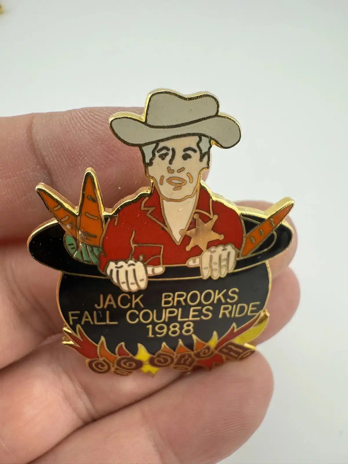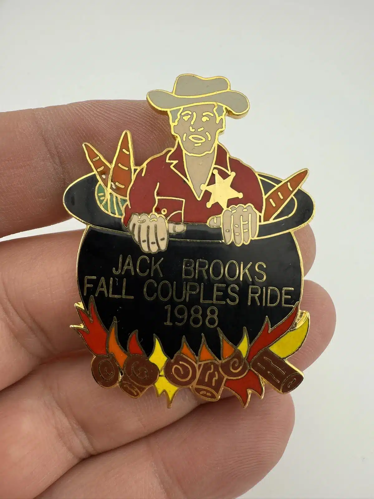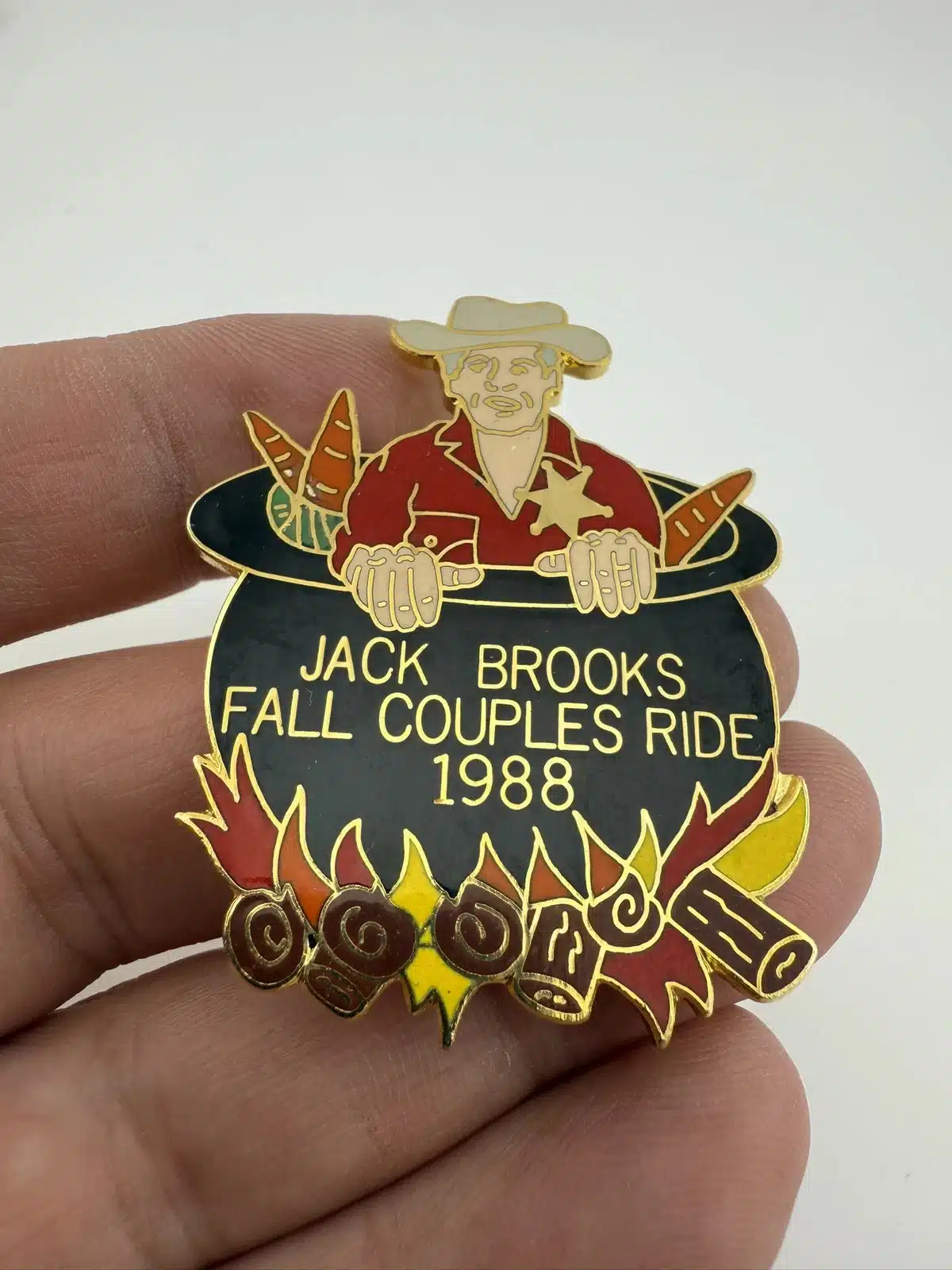This dual-clasp pin reads “Jack Brooks Fall Couples Ride 1988” and features a whimsical illustration of a man, presumably Jack, wearing a cowboy hat and sheriff’s badge sitting in a stew pot filled with carrots over an open fire. The exact context is unclear, but it may be associated with a motorcycle ride or rally event.