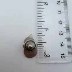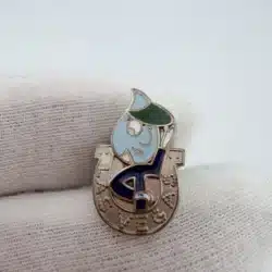 This vintage Las Vegas Horseshoe pin features a water drop shaped mascot character wearing a green dealer’s hat. The character is positioned inside a silver tone horseshoe that reads “Las Vegas.” This pin measures approximately 1/2 inches in width by just over 3/4 inches in height.