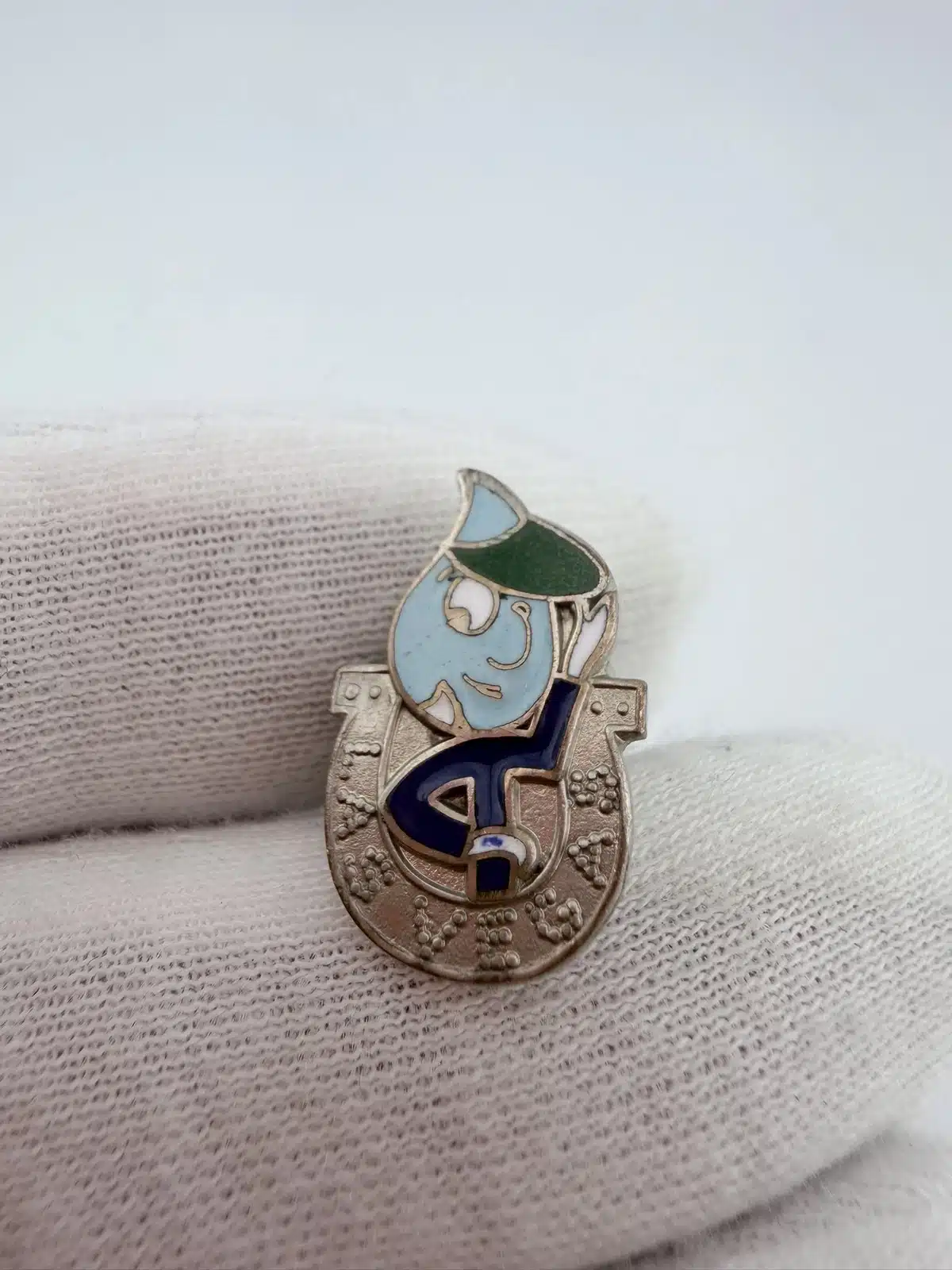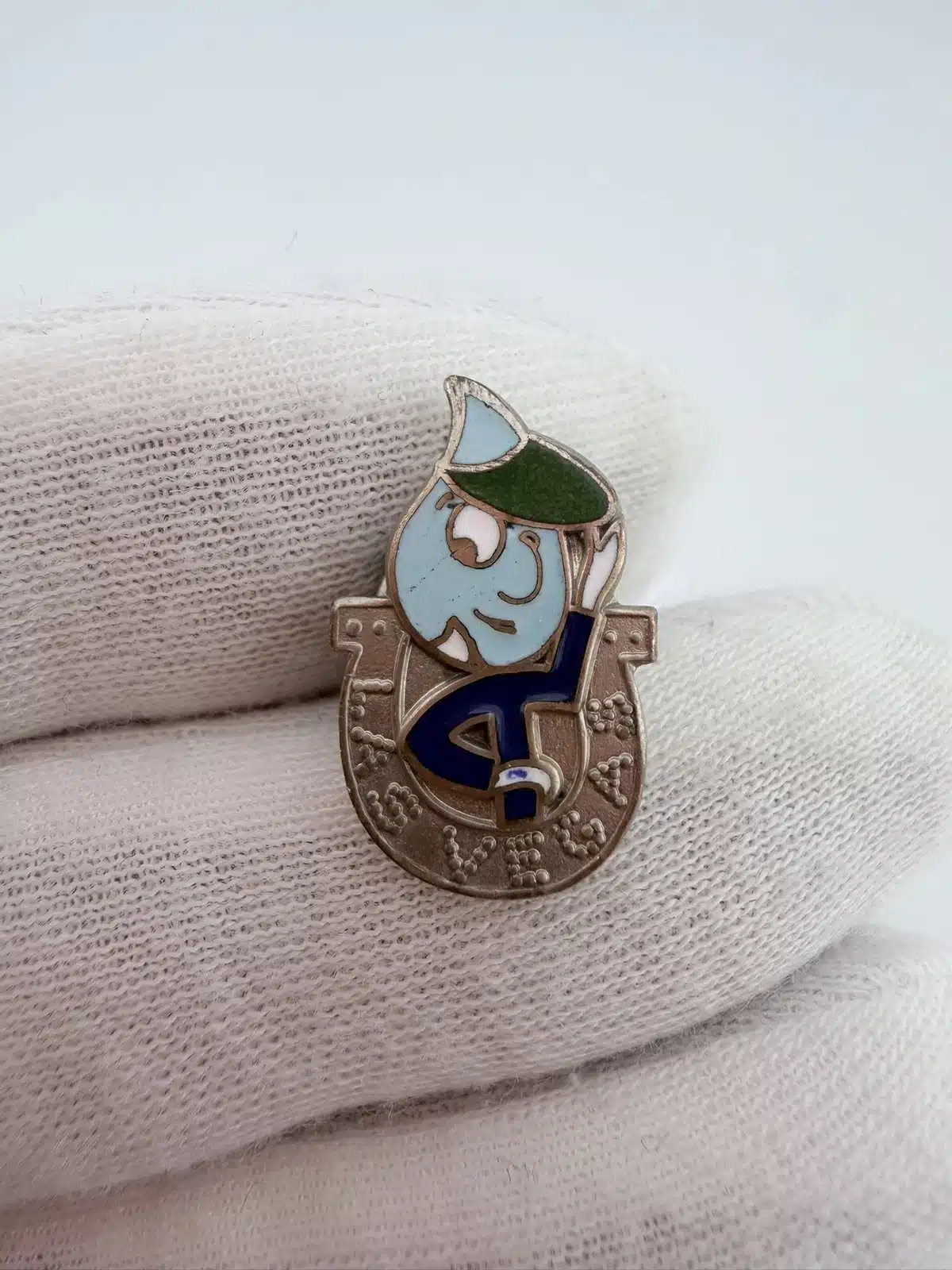 This vintage Las Vegas Horseshoe pin features a water drop shaped mascot character wearing a green dealer’s hat. The character is positioned inside a silver tone horseshoe that reads “Las Vegas.” This pin measures approximately 1/2 inches in width by just over 3/4 inches in height.