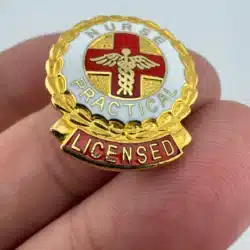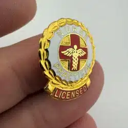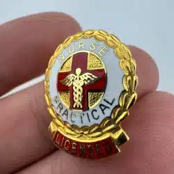 Featuring a vertical layout, this pin shows a red cross with a caduceus positioned over it. The front includes white and red enamel details, with “Nurse” at the top along with “Practical” and Licensed” arranged toward the bottom.
