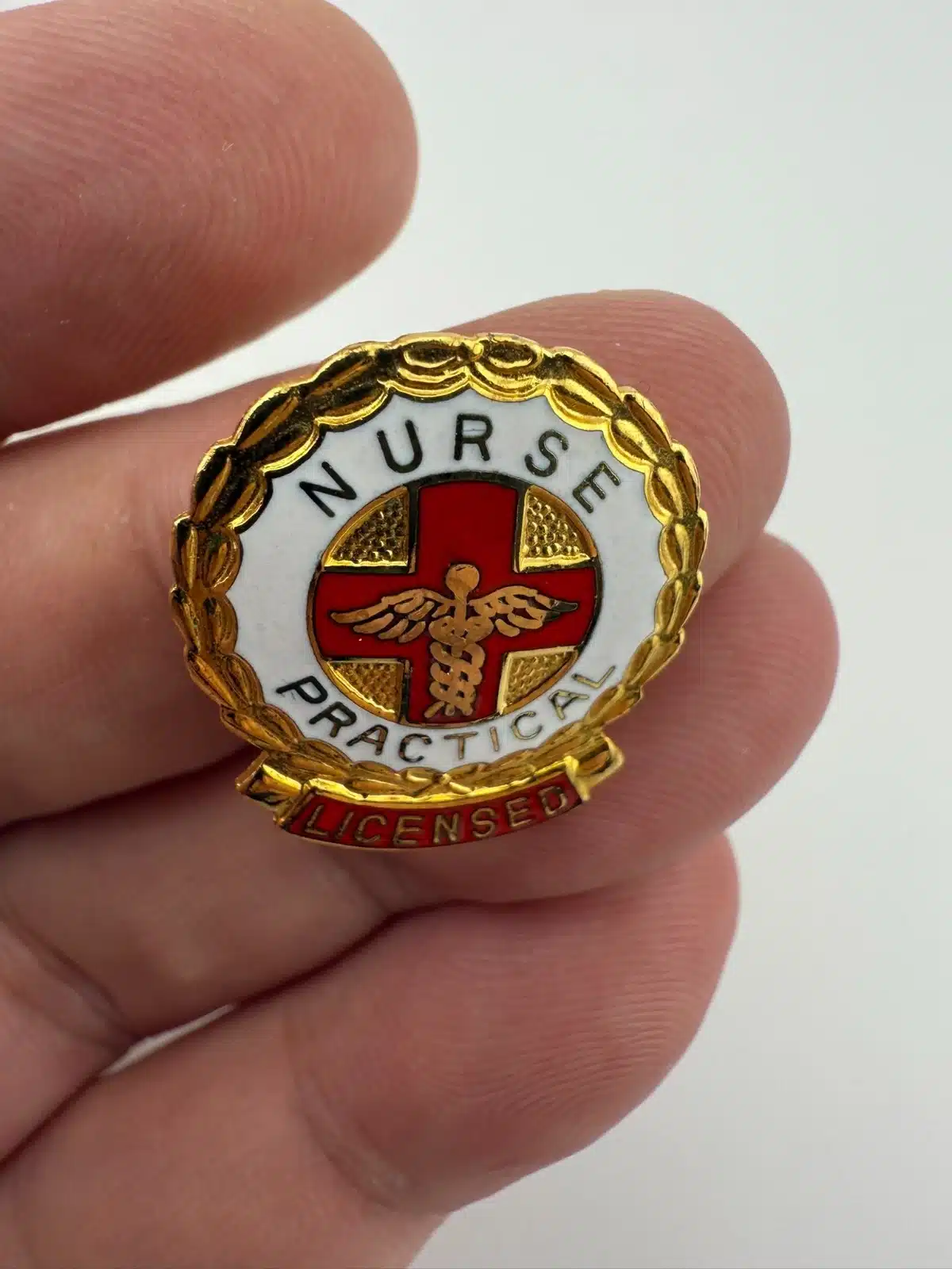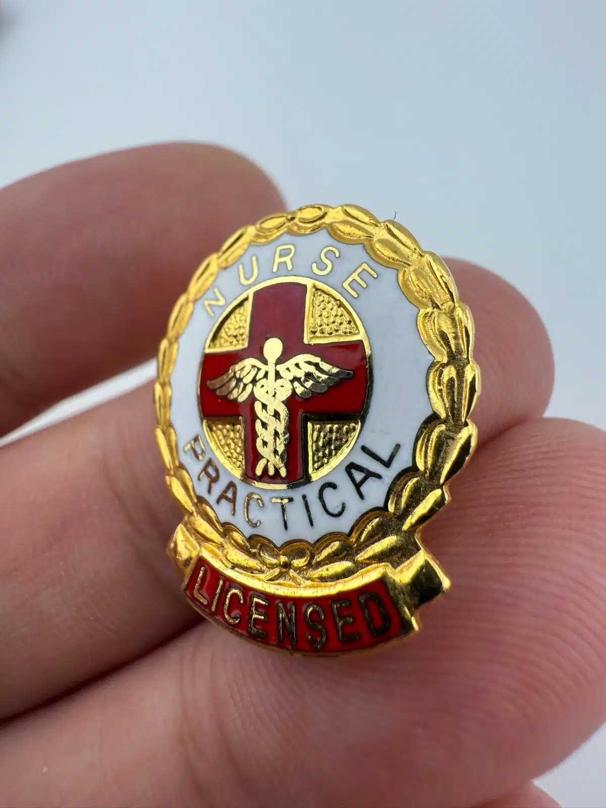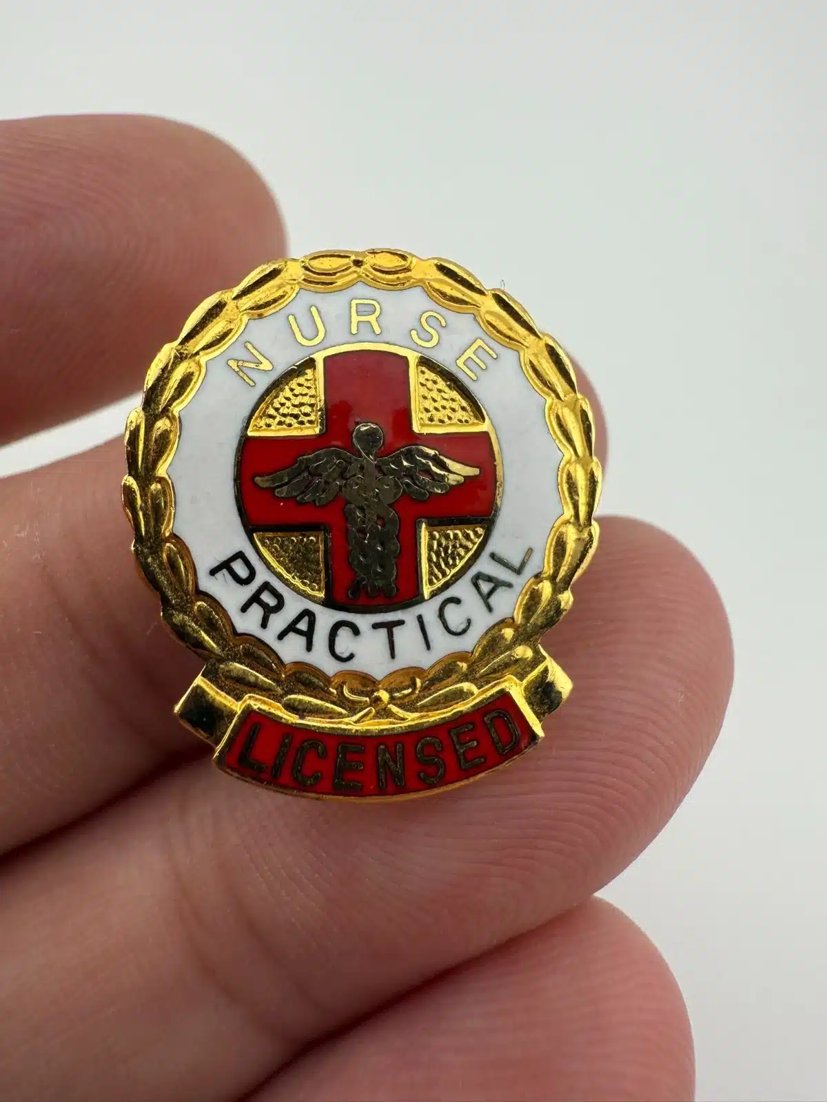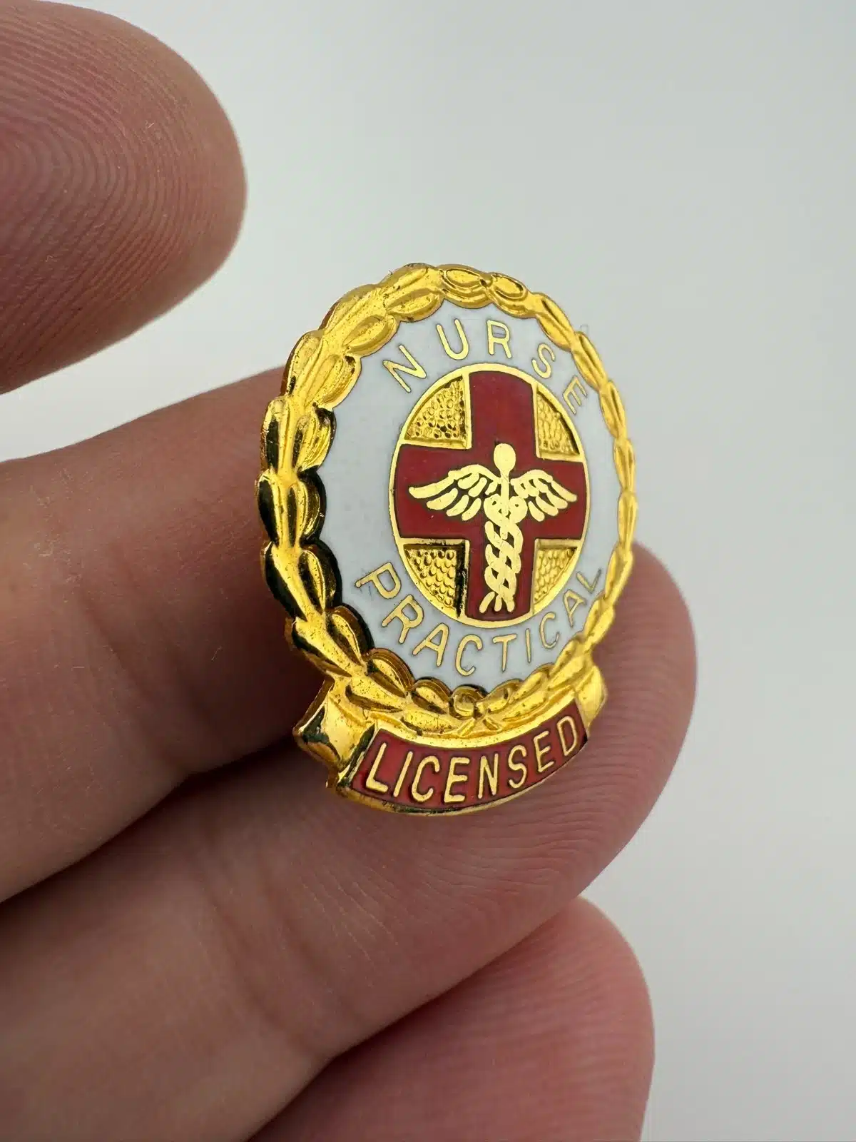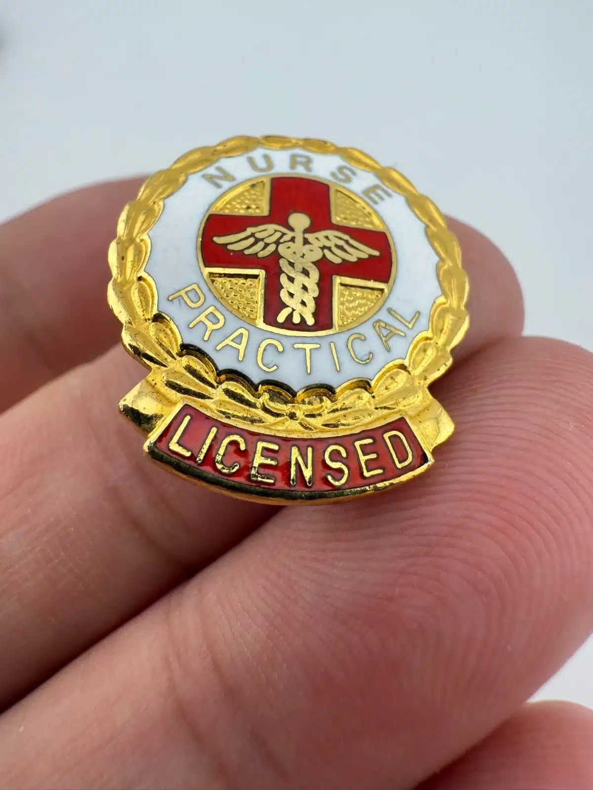 Featuring a vertical layout, this pin shows a red cross with a caduceus positioned over it. The front includes white and red enamel details, with “Nurse” at the top along with “Practical” and Licensed” arranged toward the bottom.