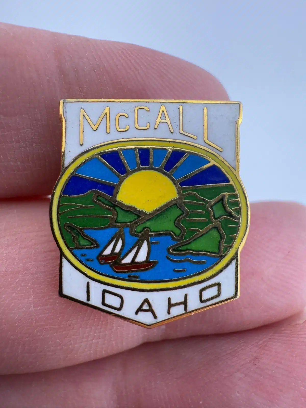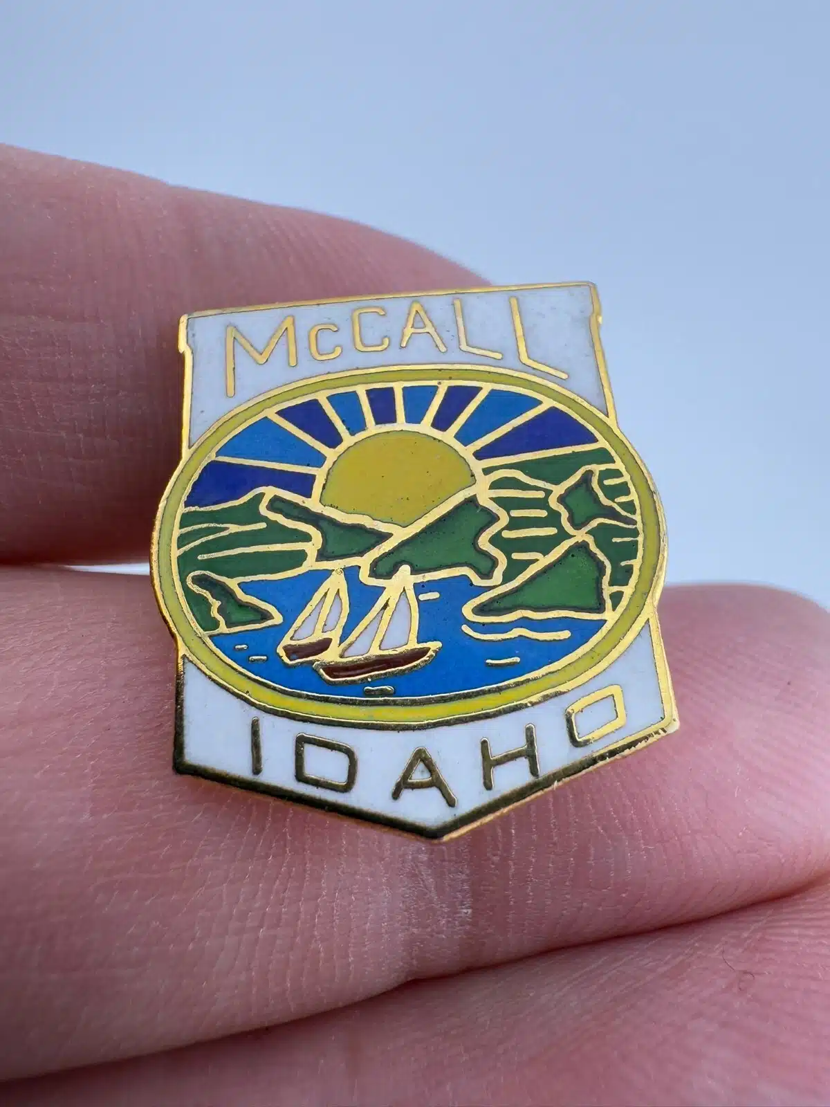 Vintage McCall Idaho Travel Pin with Sailboats, Water, Mountains, and Sun