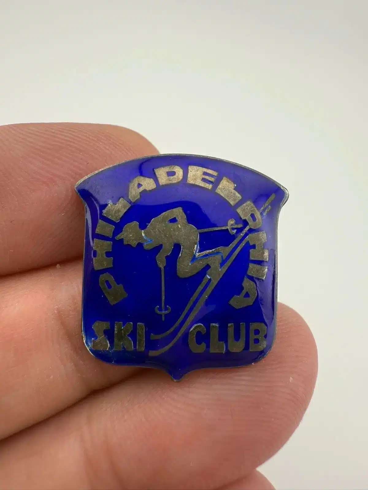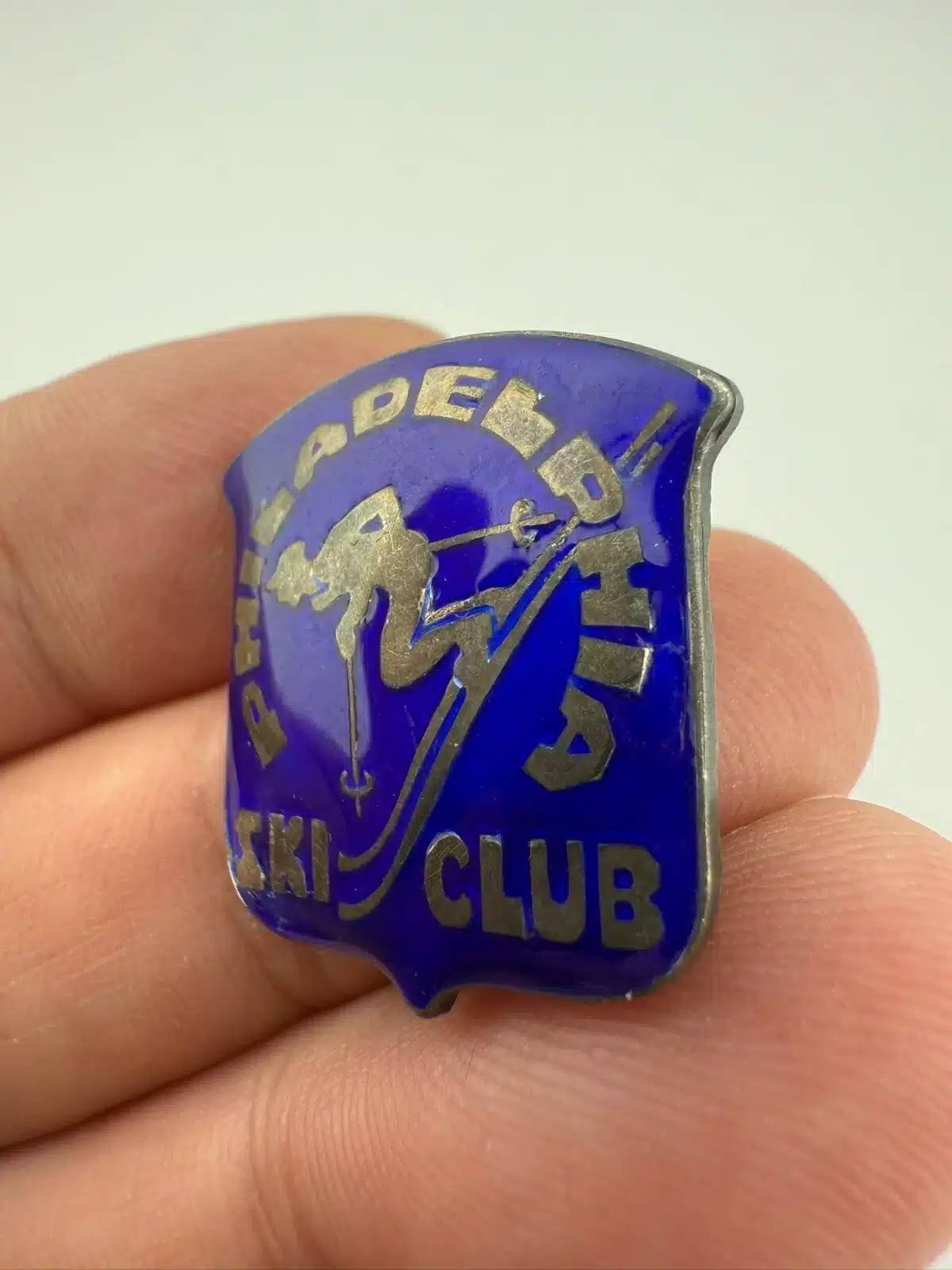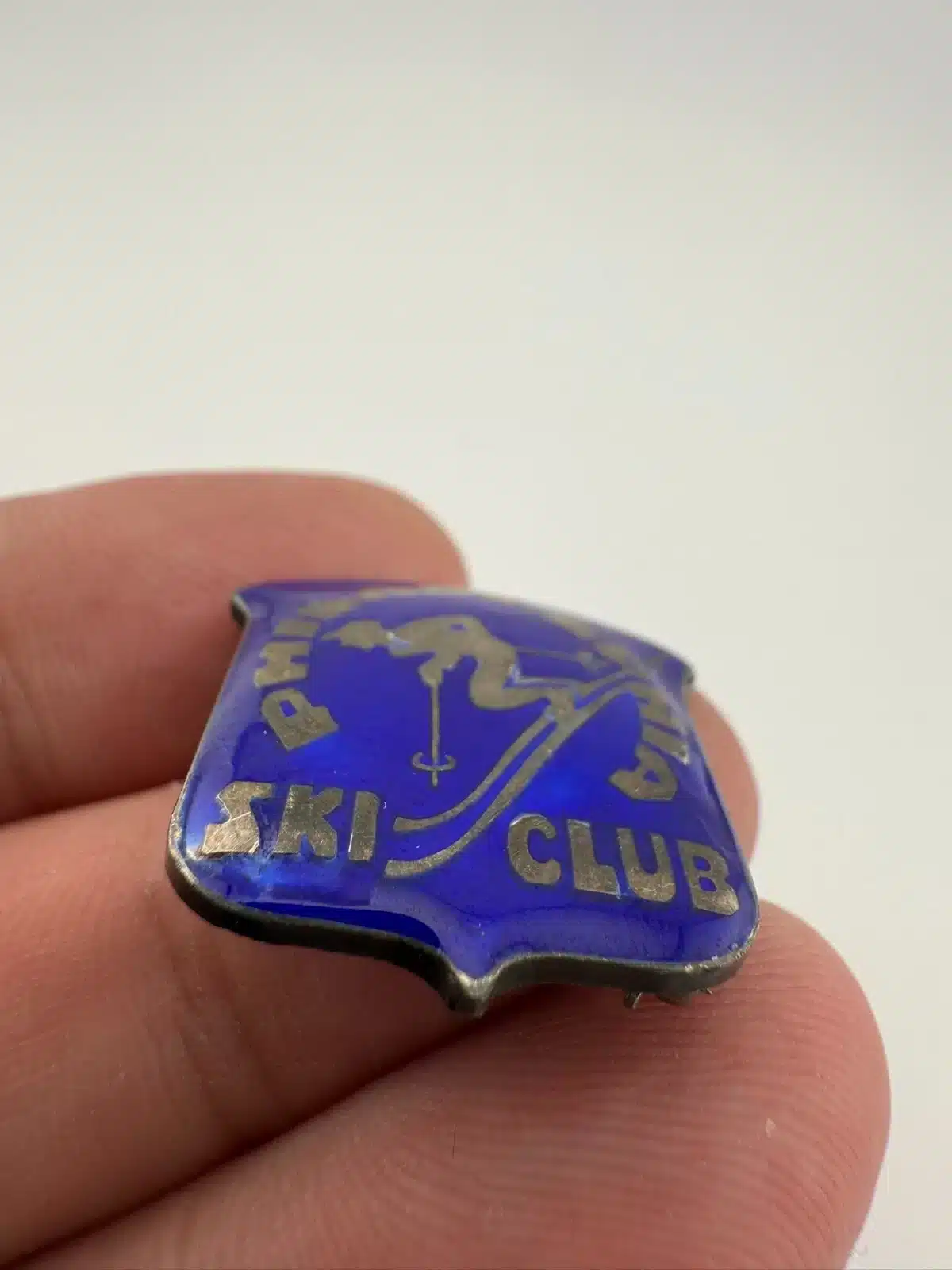 Used with marks including possible manufacturing flaw around the letter S in Ski Club. Sort of like crushed enamel. Please see all photos for exact condition of item and size.