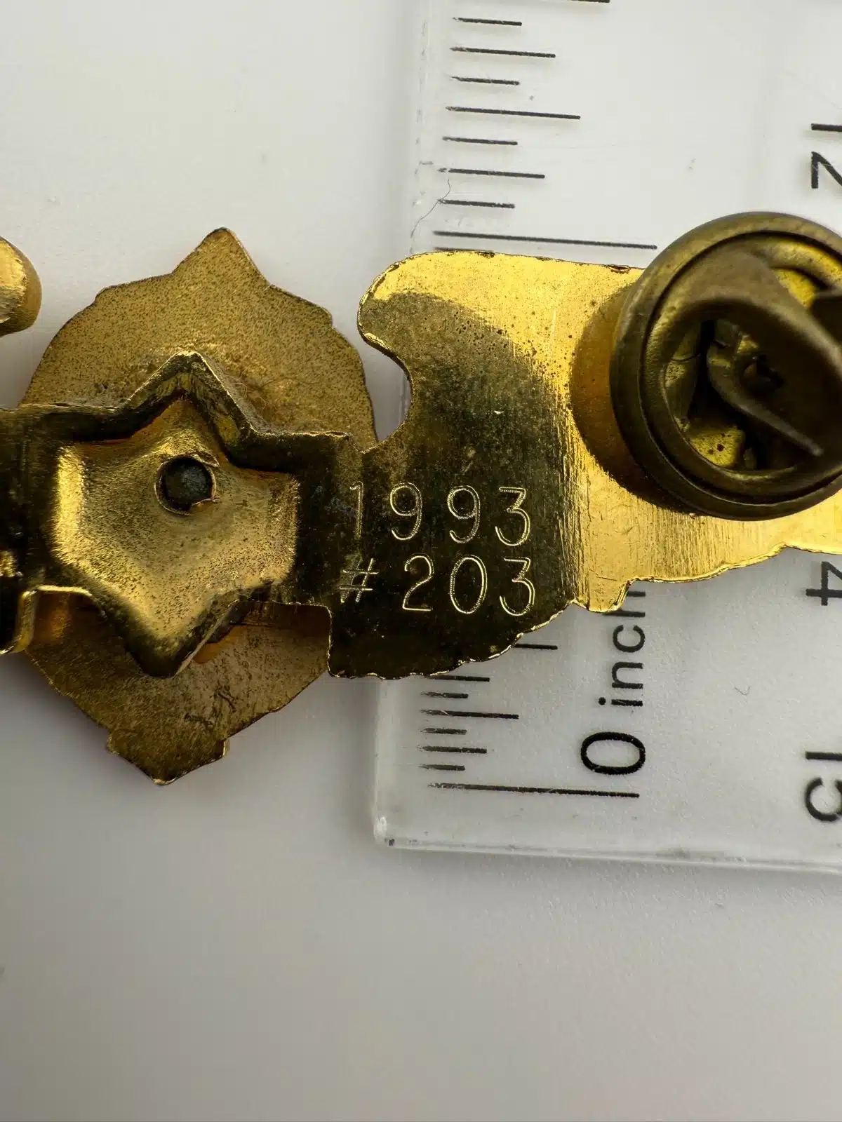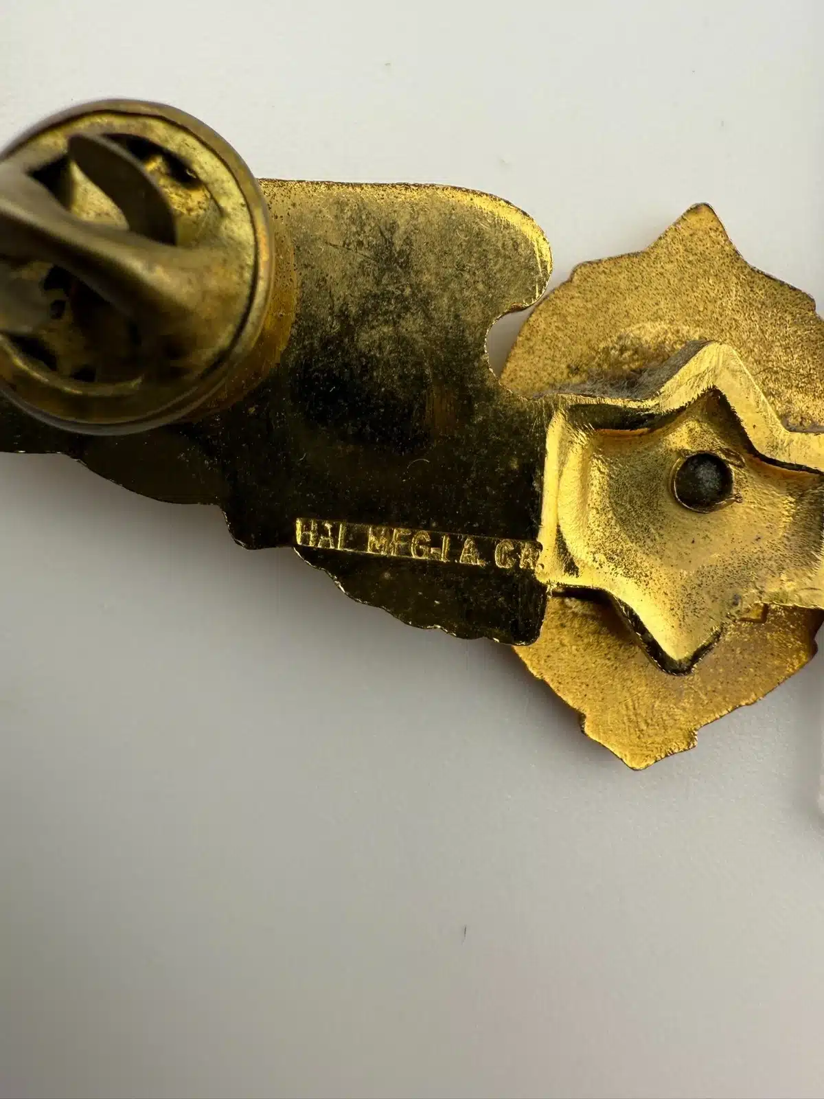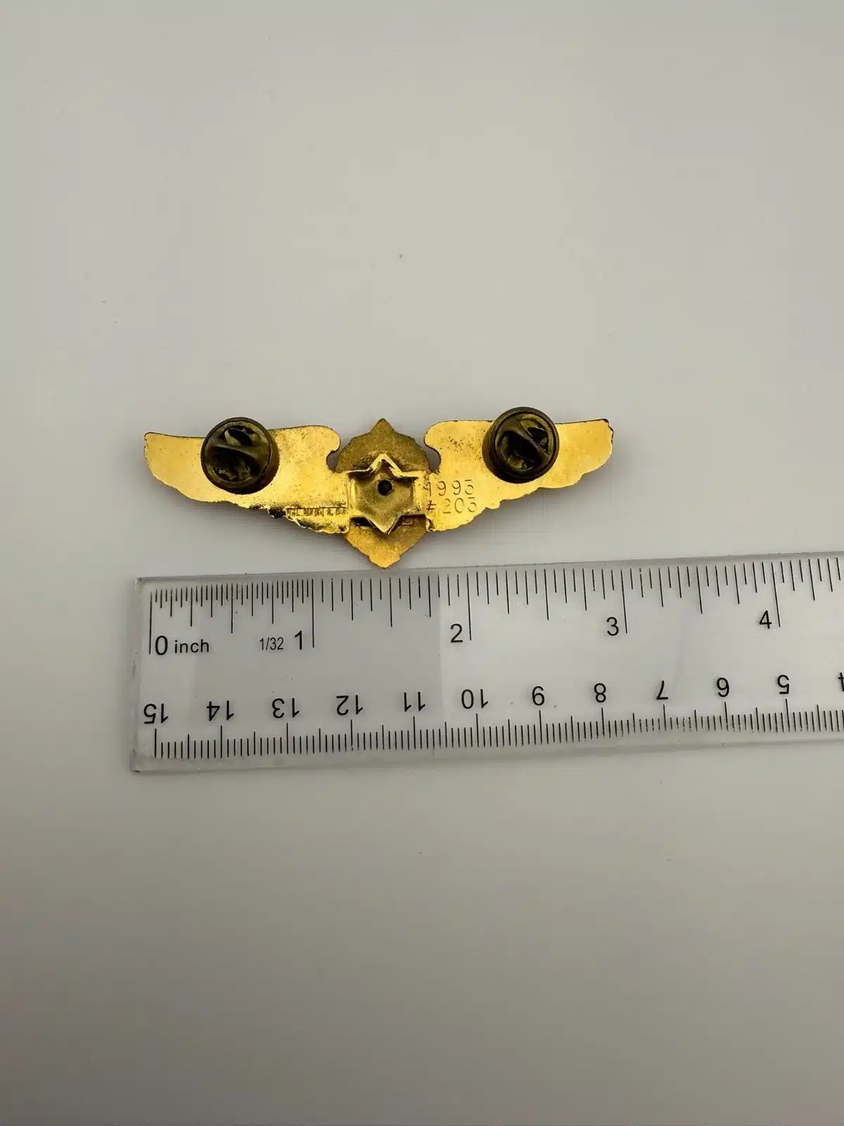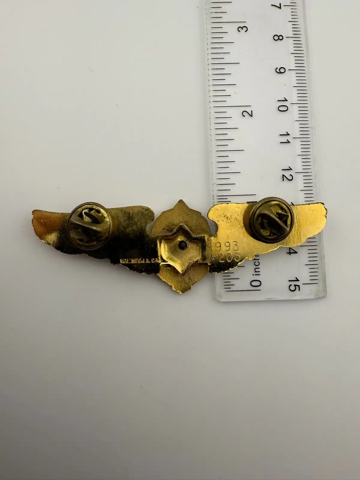 Condition: Used with marks including wear, buildup, age, flaws, etc. Unique piece. Produced by HAL MFG Los Angeles California, and etched 1993 #203. Unsure how the front badge overlay is attached, but there is a layer of glue between the rear wings and top badge layer to keep it in place as well. Please review all photos for exact condition of item and size.