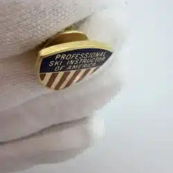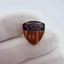 This vintage PSIA Professional Ski Instructors Of America pin by ESCO features a classic crest-shaped design in gold tone which represents a Level 3 achievement. The top portion is finished in blue enamel with the words “Professional Ski Instructors Of America” displayed across it, giving the piece a formal, emblematic look.