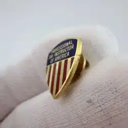 Below, vertical red enamel stripes create a flag-like presence, adding strong color contrast and a patriotic feel to the overall design. The structured layout and enamel detailing reflect the professional identity of the organization.