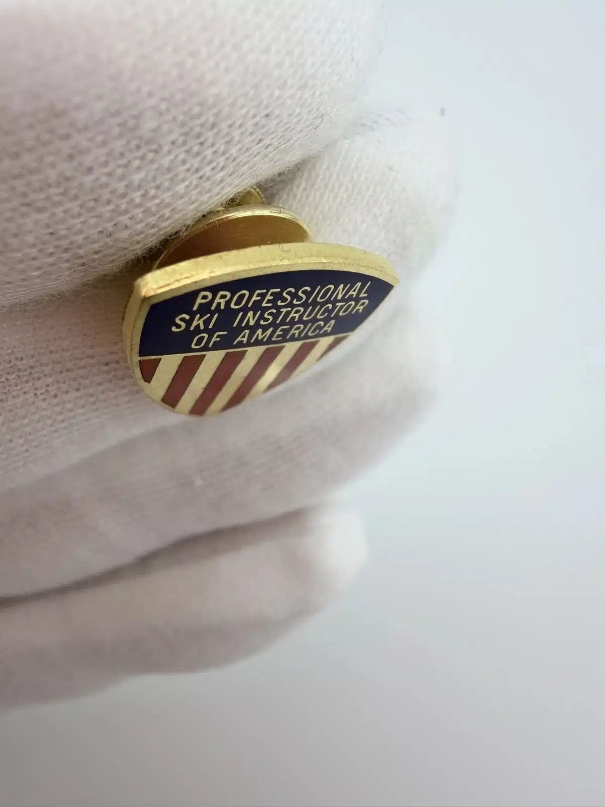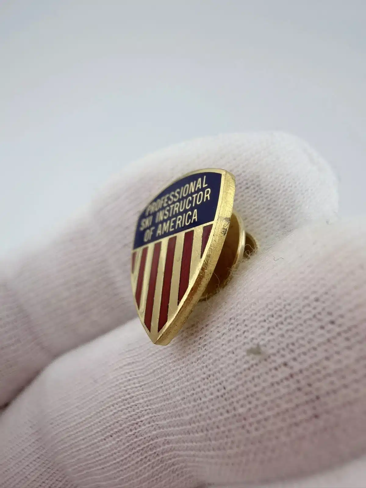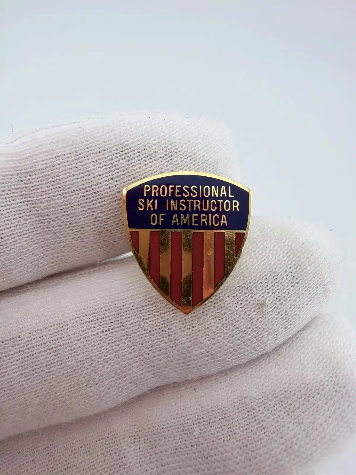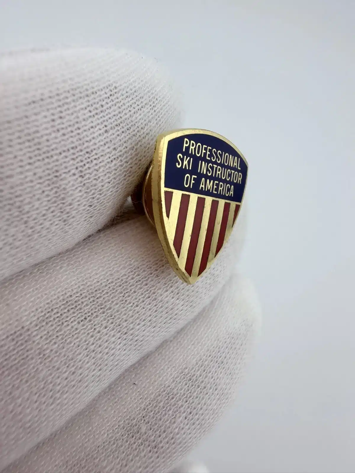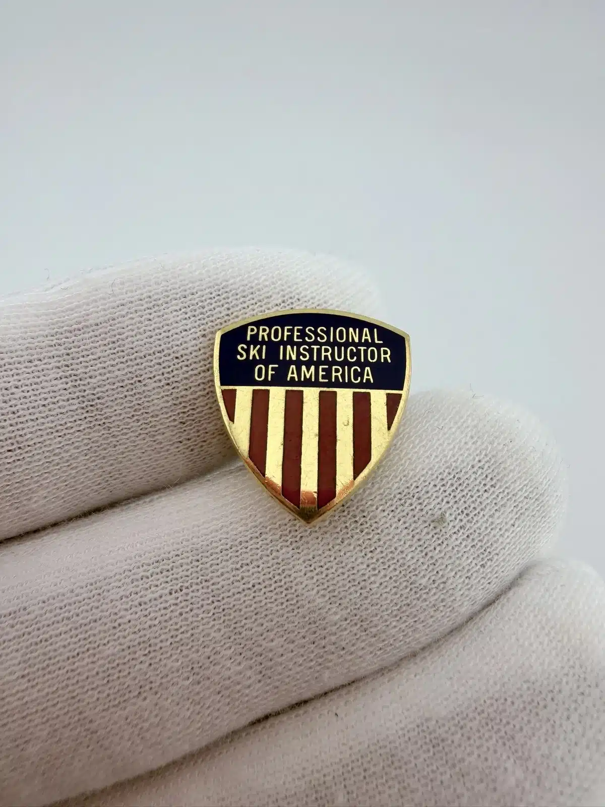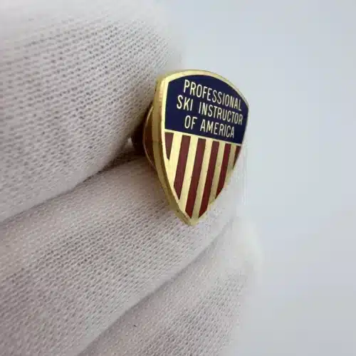 This vintage PSIA Professional Ski Instructors Of America pin by ESCO features a classic crest-shaped design in gold tone which represents a Level 3 achievement. The top portion is finished in blue enamel with the words “Professional Ski Instructors Of America” displayed across it, giving the piece a formal, emblematic look.