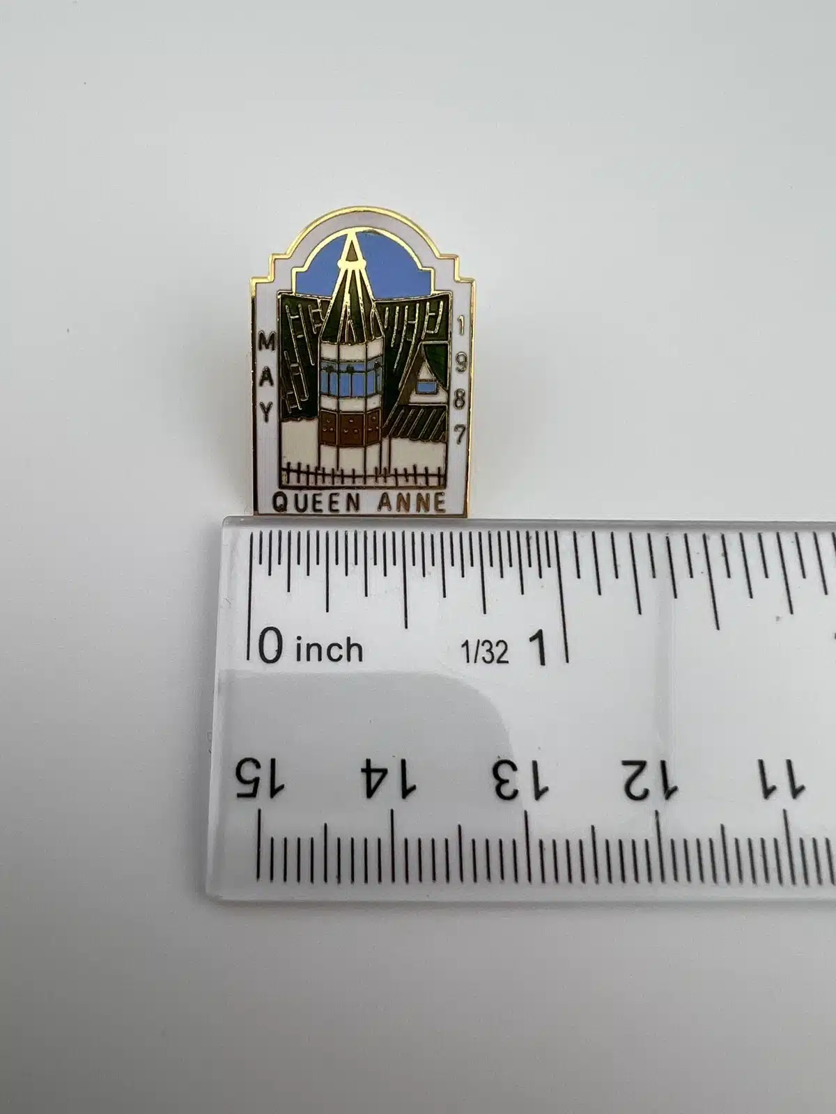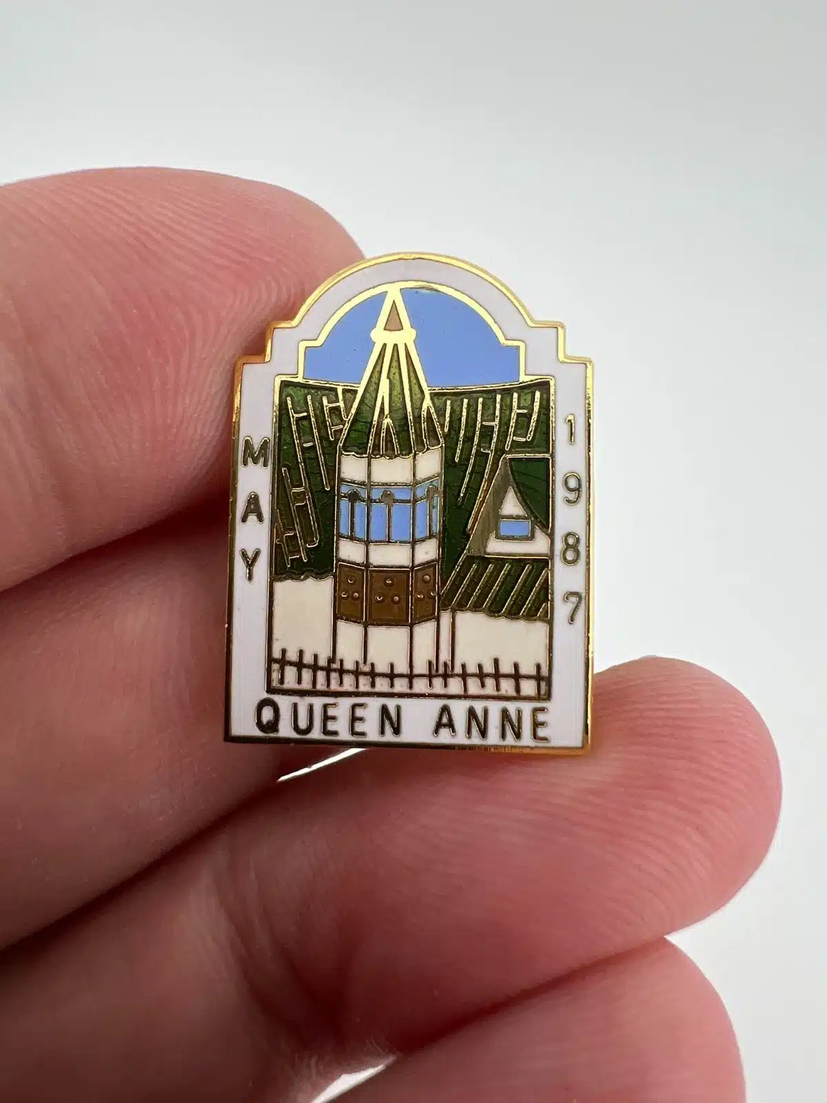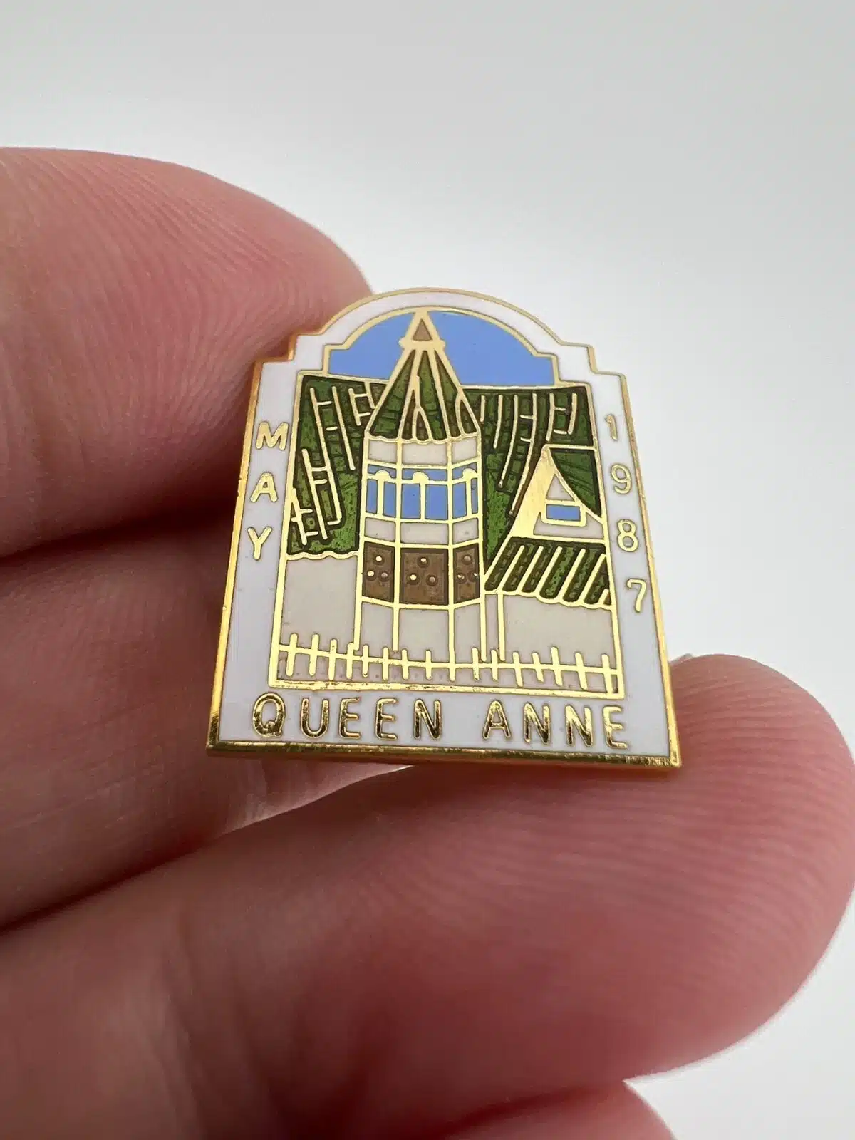Vintage Queen Anne Lapel Hat Pin – May 1987 – Church with steeple