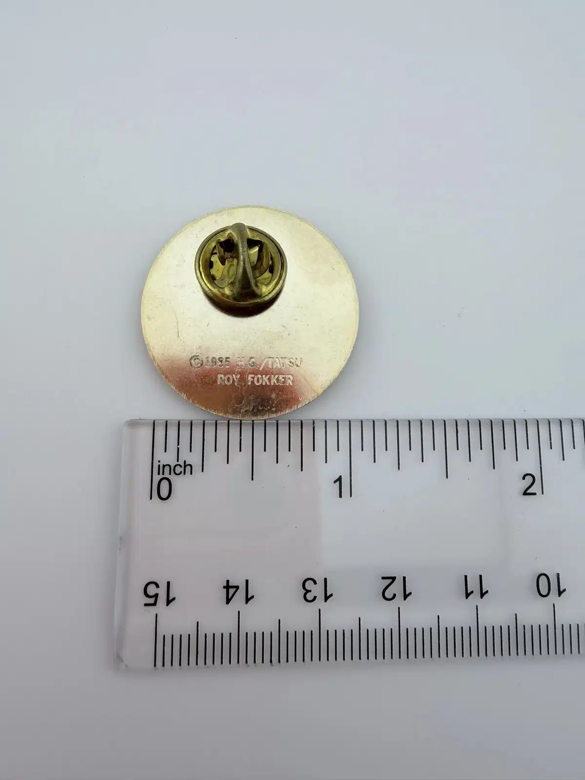 On the reverse, the pin is marked “1985 H.G. / TATSU” along with Roy Fokker, referencing the original production timeframe and associated rights holders.