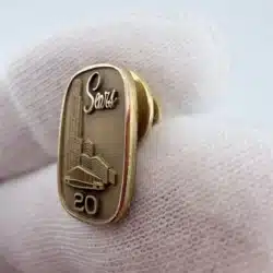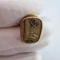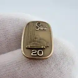 This vintage pin commemorates 20 years of service at Sears, with the company name displayed prominently at the top right. The design features a detailed illustration of a large building spanning the left side and center, with the number “20” elegantly positioned below, marking the service milestone.