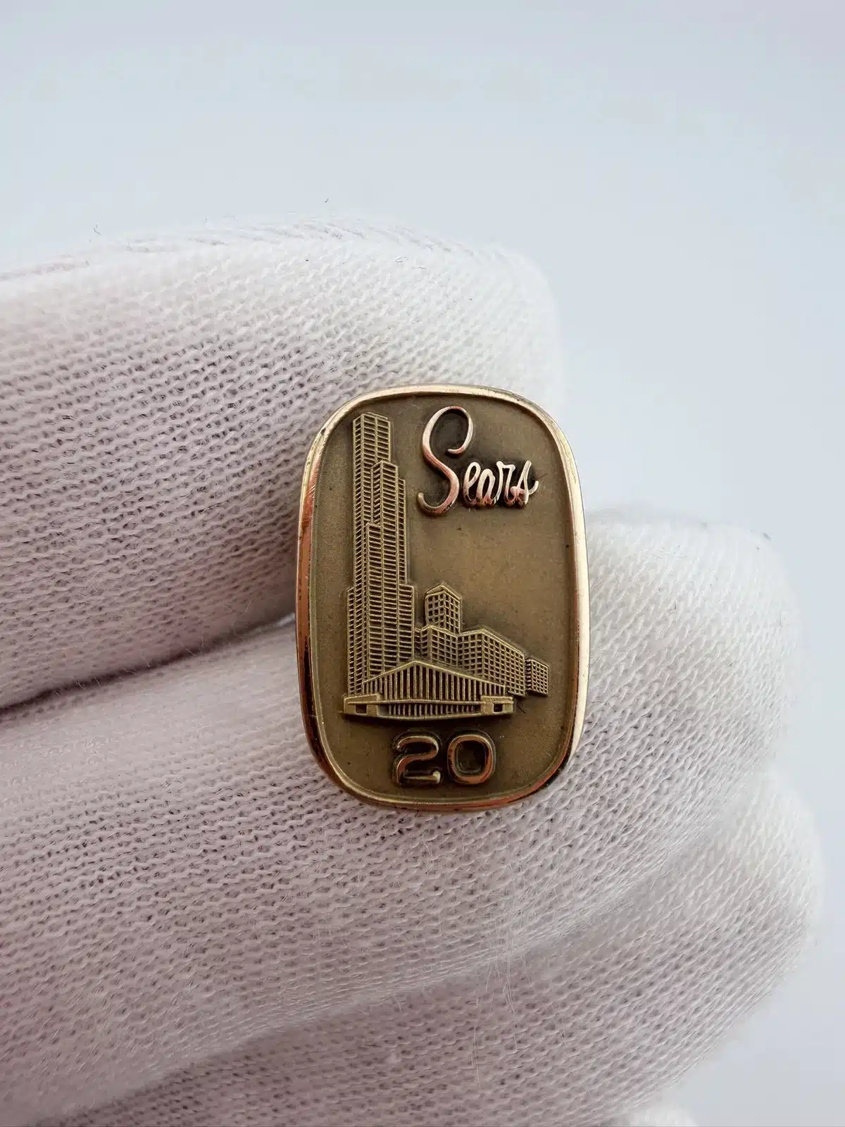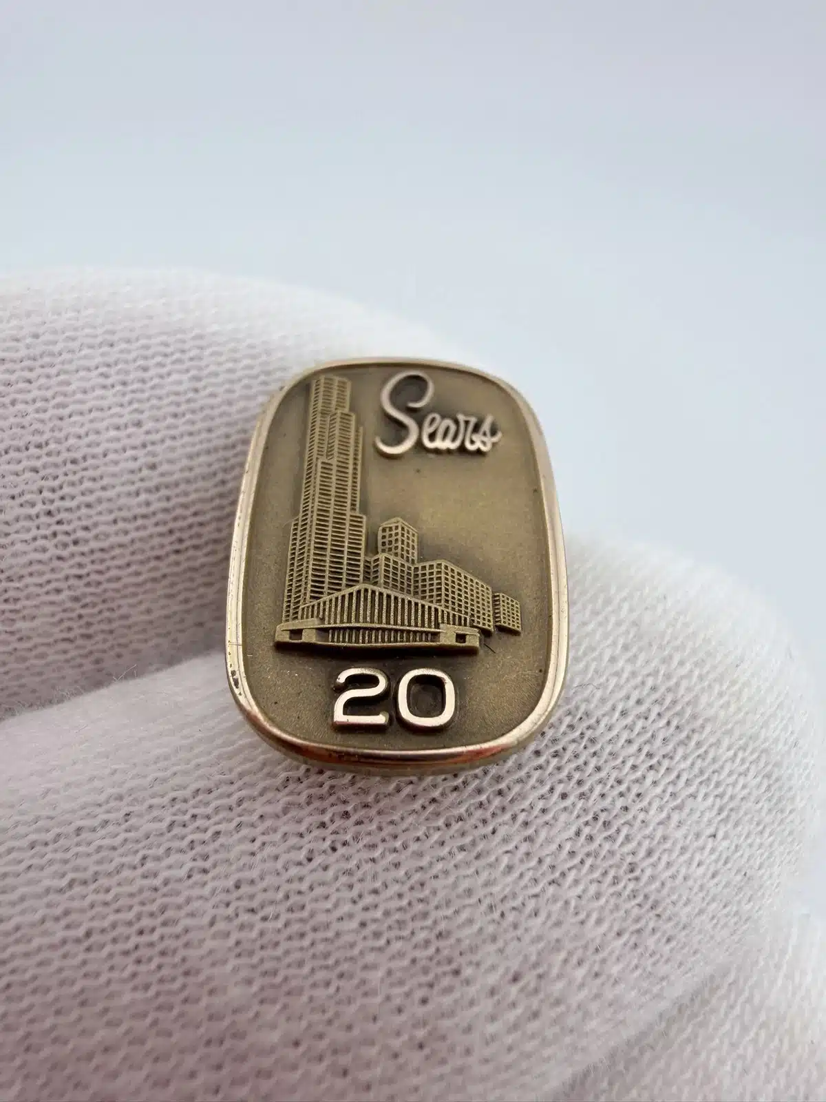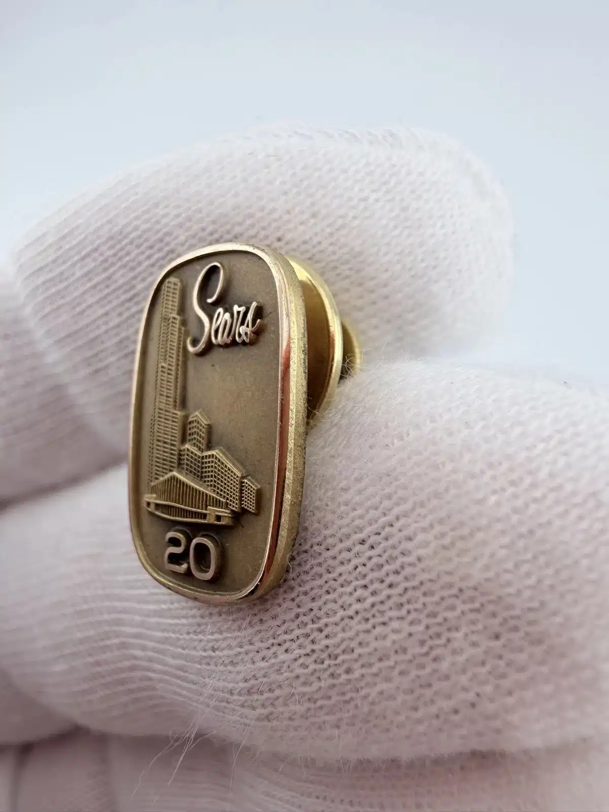 This vintage pin commemorates 20 years of service at Sears, with the company name displayed prominently at the top right. The design features a detailed illustration of a large building spanning the left side and center, with the number “20” elegantly positioned below, marking the service milestone.