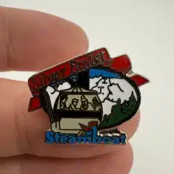 Featuring a detailed design including mountains, trees, and blue skies, this vintage pin celebrates the Silver Bullet Gondola at Steamboat Ski Resort.