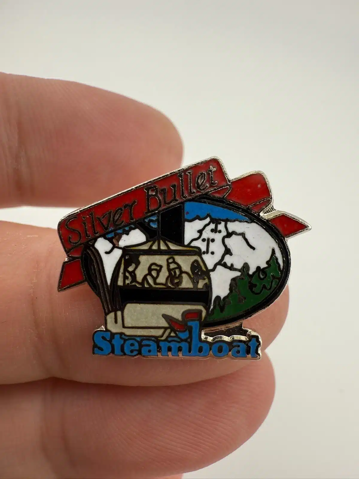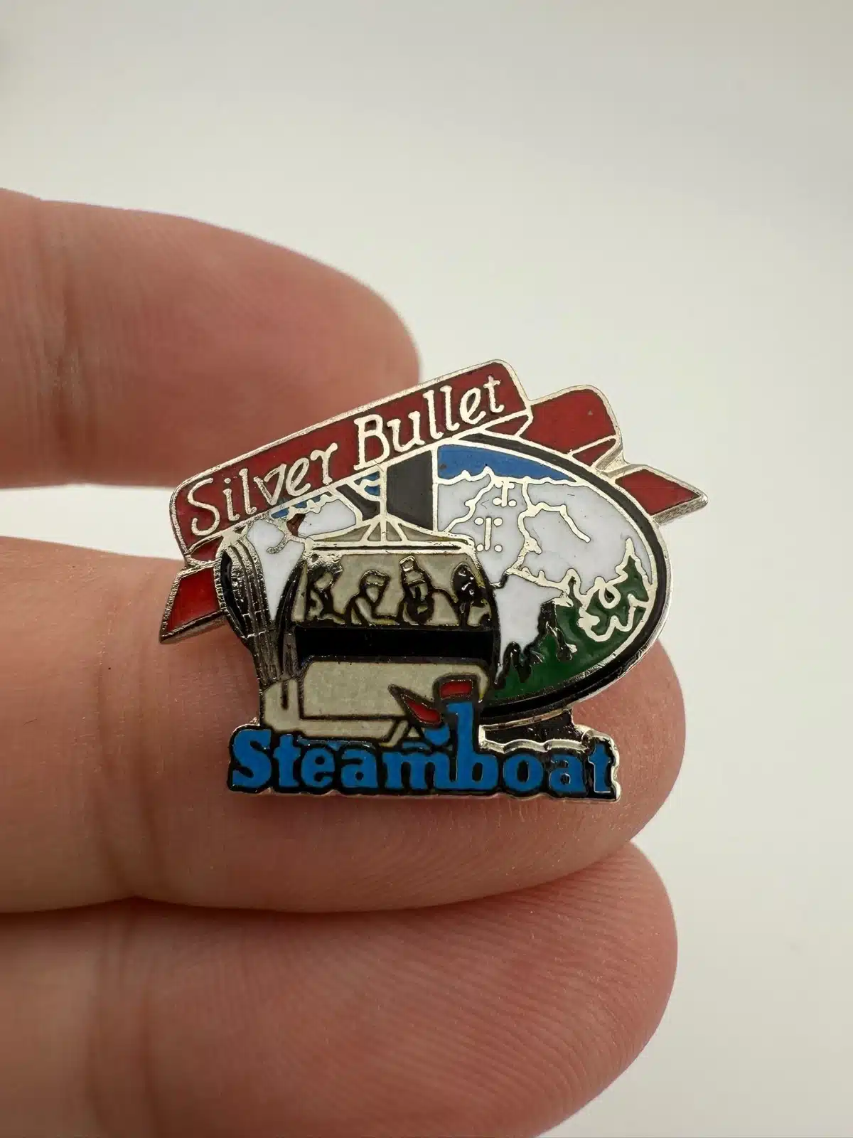 Featuring a detailed design including mountains, trees, and blue skies, this vintage pin celebrates the Silver Bullet Gondola at Steamboat Ski Resort.