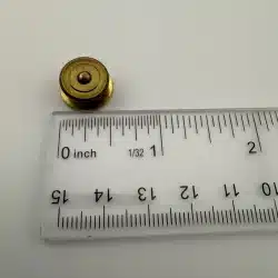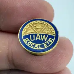 This vintage UAW United Auto Workers Local 879 screwback pin features a circular design with a blue enamel background and gold tone highlights. The top portion shows a car, airplane, and tractor, representing the union’s connection to multiple manufacturing industries including automotive, aerospace, and agricultural equipment.