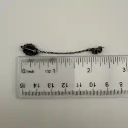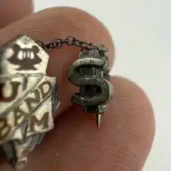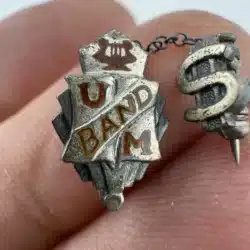 This unique and rare University of Minnesota band pin brooch features a chain with an attached letter S pin, possibly referencing the string section. The pin is unmarked, with the exact age and metal unknown. It was found alongside several University of Minnesota buttons, which supports its association with the university’s band program. The band has a storied history since its founding in 1892.