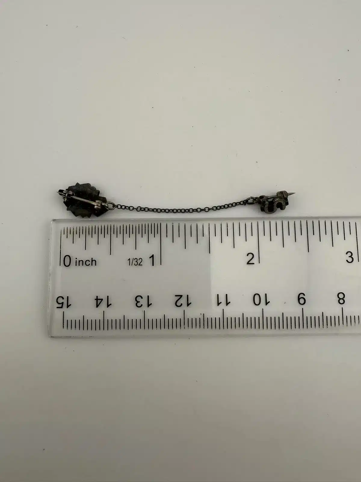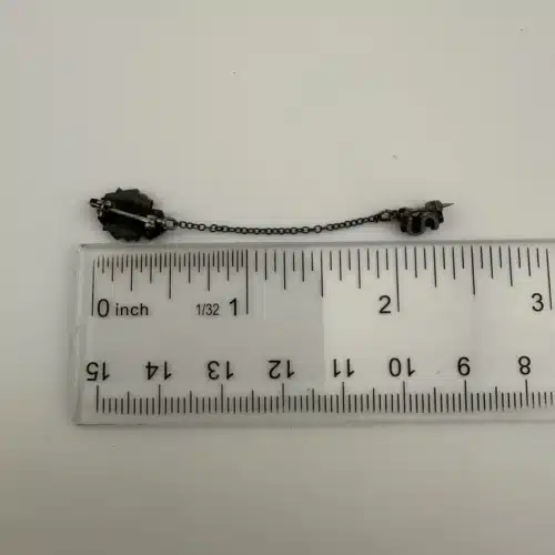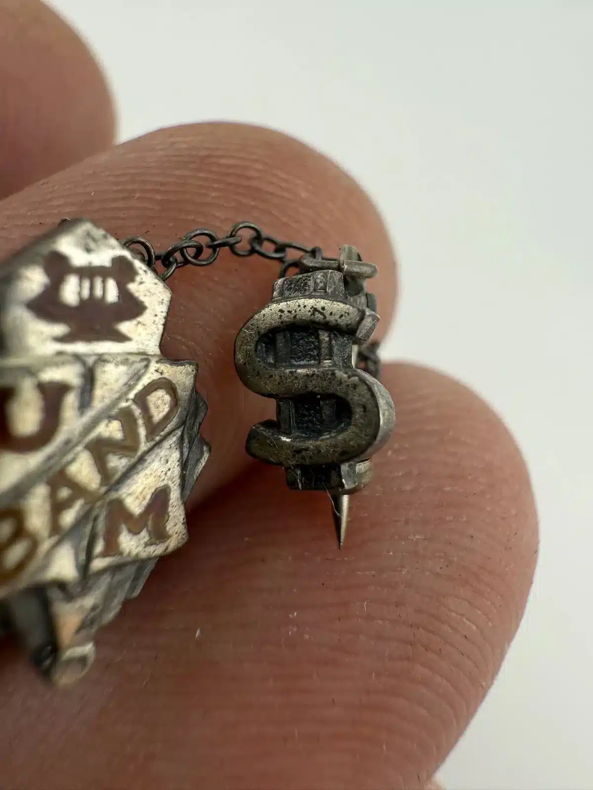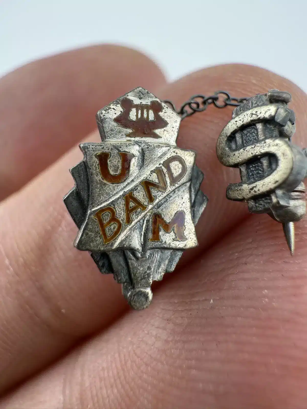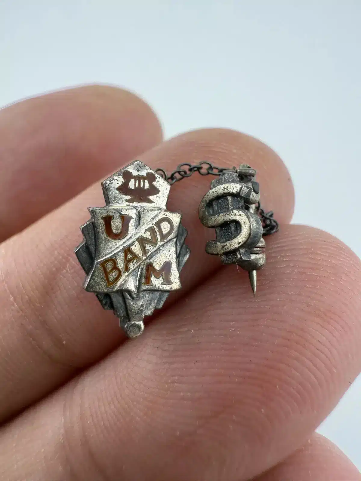 This unique and rare University of Minnesota band pin brooch features a chain with an attached letter S pin, possibly referencing the string section. The pin is unmarked, with the exact age and metal unknown. It was found alongside several University of Minnesota buttons, which supports its association with the university’s band program. The band has a storied history since its founding in 1892.