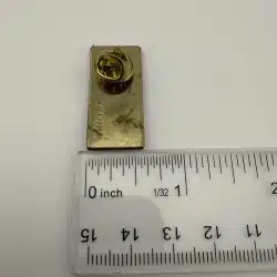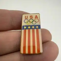 This vintage pin features a vertical banner shape that elegantly combines the USA flag and the Olympic rings, symbolizing the spirit of international competition and unity.