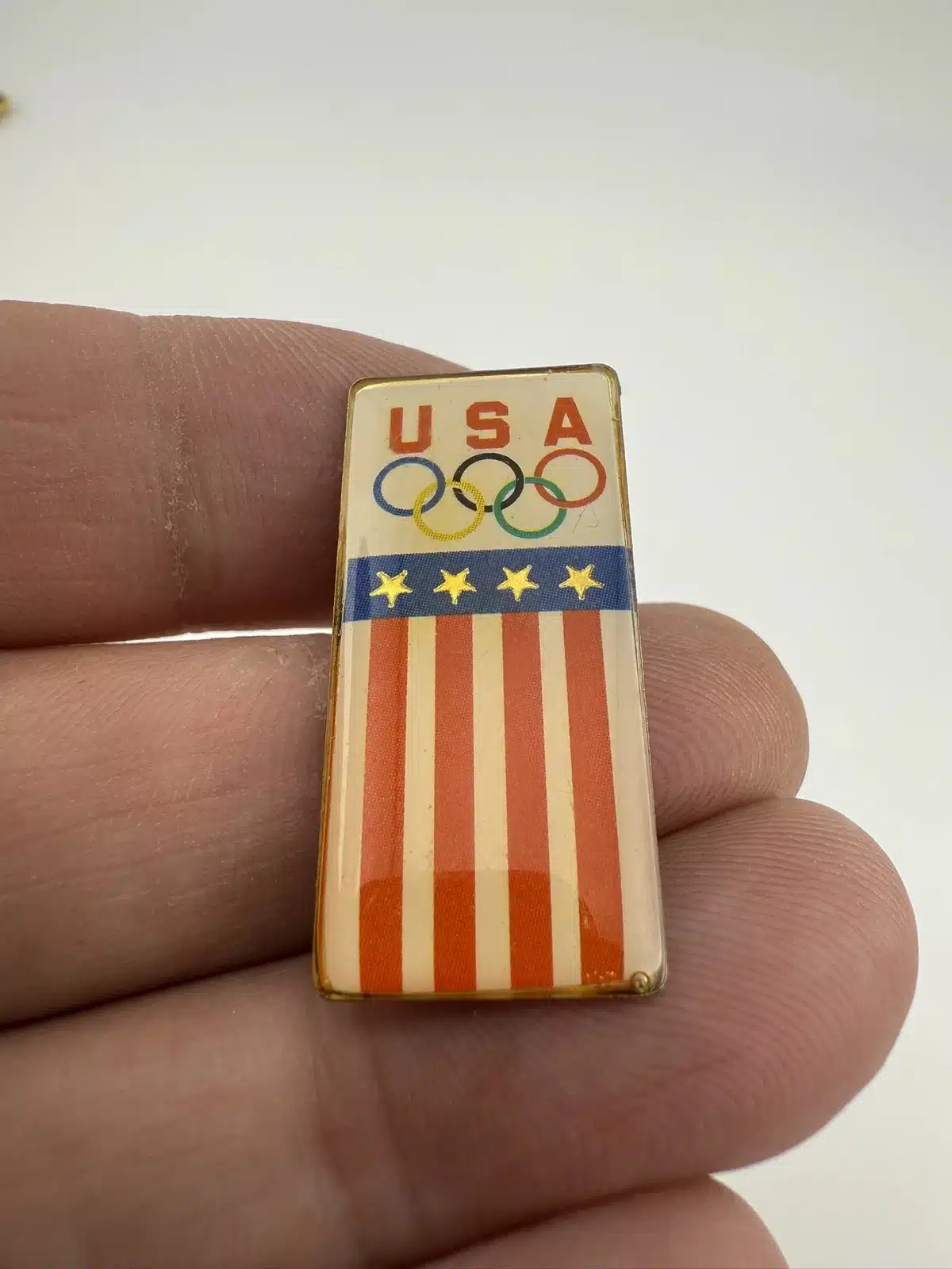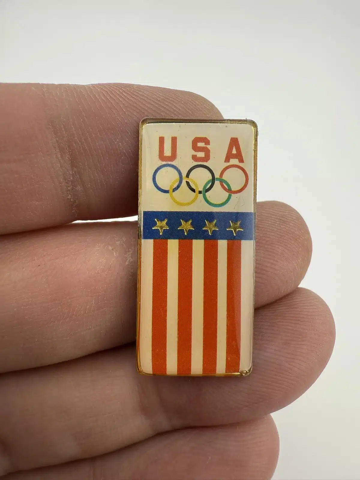This vintage pin features a vertical banner shape that elegantly combines the USA flag and the Olympic rings, symbolizing the spirit of international competition and unity.