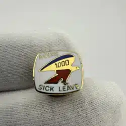 This vintage pin features the emblem of the U.S. Postal Service, celebrating the 1000 Hour Sick Leave Award with a design that reflects the organization’s commitment to its employees. The pin’s intricate detailing and classic color palette underscore its significance as a piece of postal history.