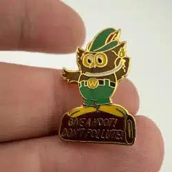 A rare Vintage Woodsy Owl ‘Give A Hoot! Don’t Pollute!’ pin brooch from the 1970s features the iconic character promoting environmental awareness.