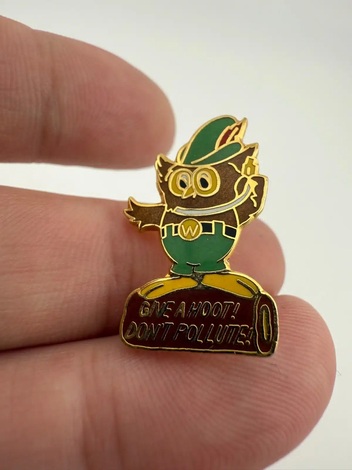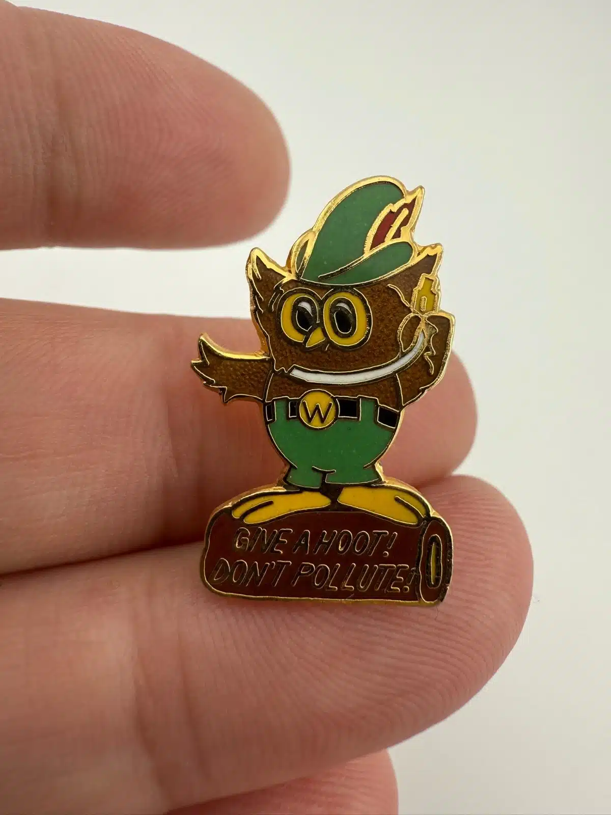 A rare Vintage Woodsy Owl ‘Give A Hoot! Don’t Pollute!’ pin brooch from the 1970s features the iconic character promoting environmental awareness.