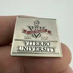 This silver-tone pin commemorates the 125th anniversary of Viterbo University, celebrating its establishment in 1890. The design features the Viterbo logo prominently displayed alongside a striking red banner that reads ‘125 years’, symbolizing the institution’s rich history and legacy. Viterbo is located in La Crosse, Wisconsin.