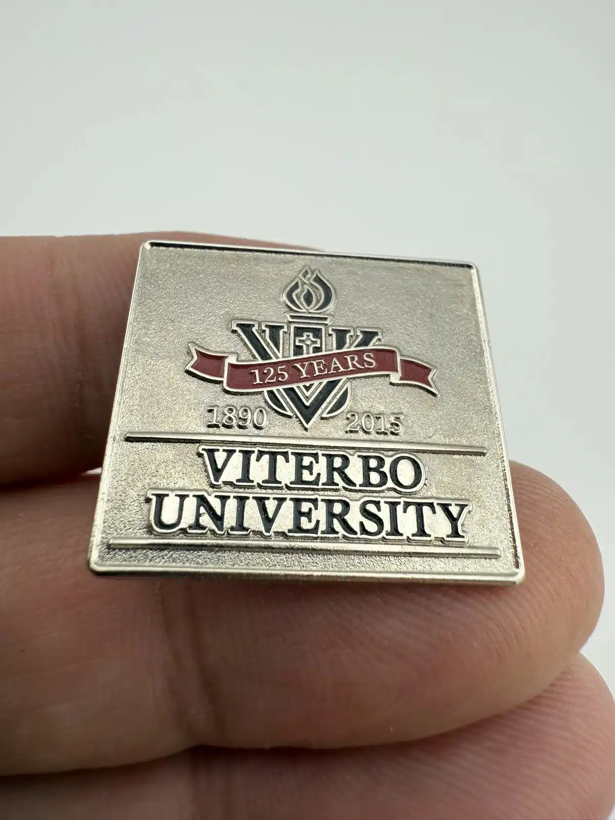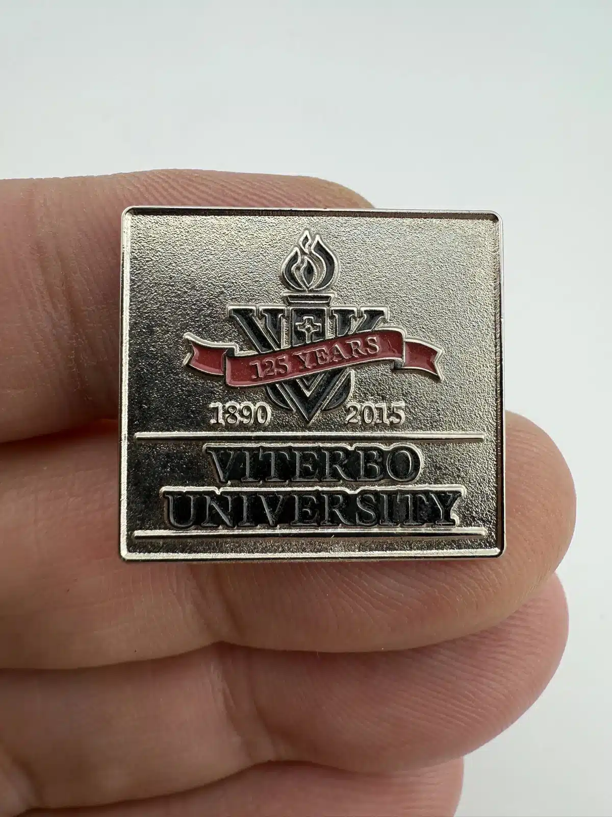 This silver-tone pin commemorates the 125th anniversary of Viterbo University, celebrating its establishment in 1890. The design features the Viterbo logo prominently displayed alongside a striking red banner that reads ‘125 years’, symbolizing the institution’s rich history and legacy. Viterbo is located in La Crosse, Wisconsin.