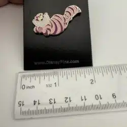 This pin features the iconic Cheshire Cat from Walt Disney’s ‘Alice in Wonderland,’ showcasing its signature wide grin and distinctive purple and pink striped fur. The design captures the whimsical essence of the character, a beloved figure from the classic 1951 animated film.