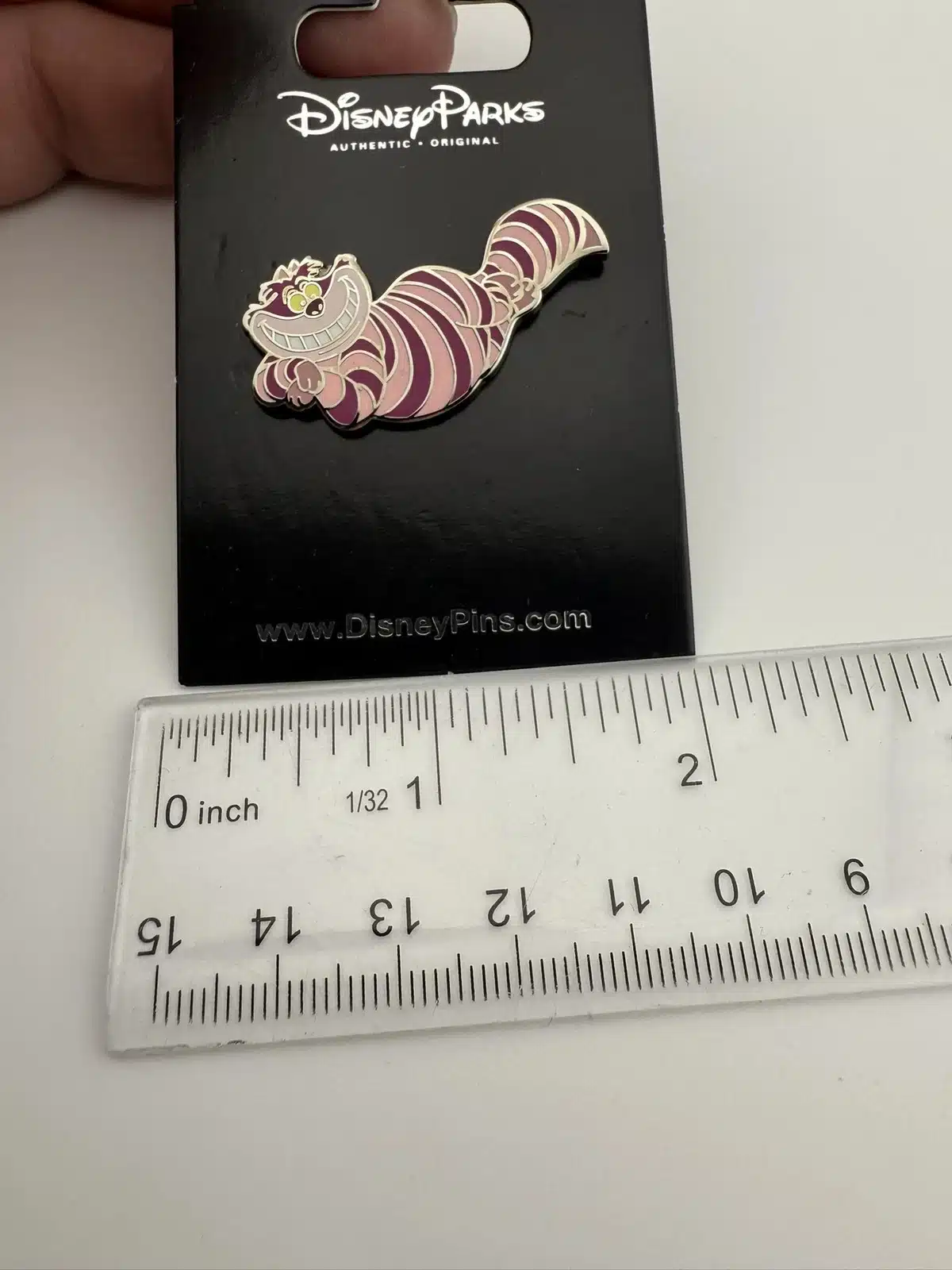 This pin features the iconic Cheshire Cat from Walt Disney’s ‘Alice in Wonderland,’ showcasing its signature wide grin and distinctive purple and pink striped fur. The design captures the whimsical essence of the character, a beloved figure from the classic 1951 animated film.