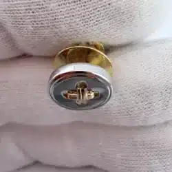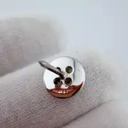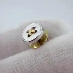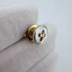 This sewing button tie tack pin features a 3/8 inch sterling silver button design accented with 14K gold thread set within the button’s four tiny holes, mimicking the look of real thread sewn through a classic four-hole button.