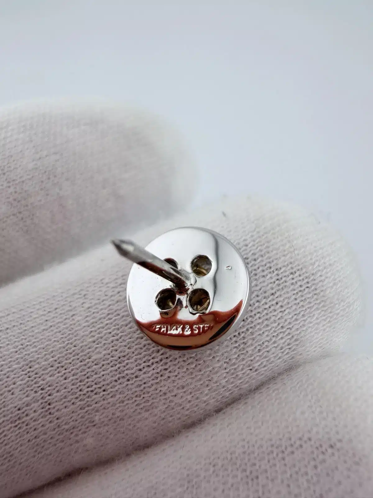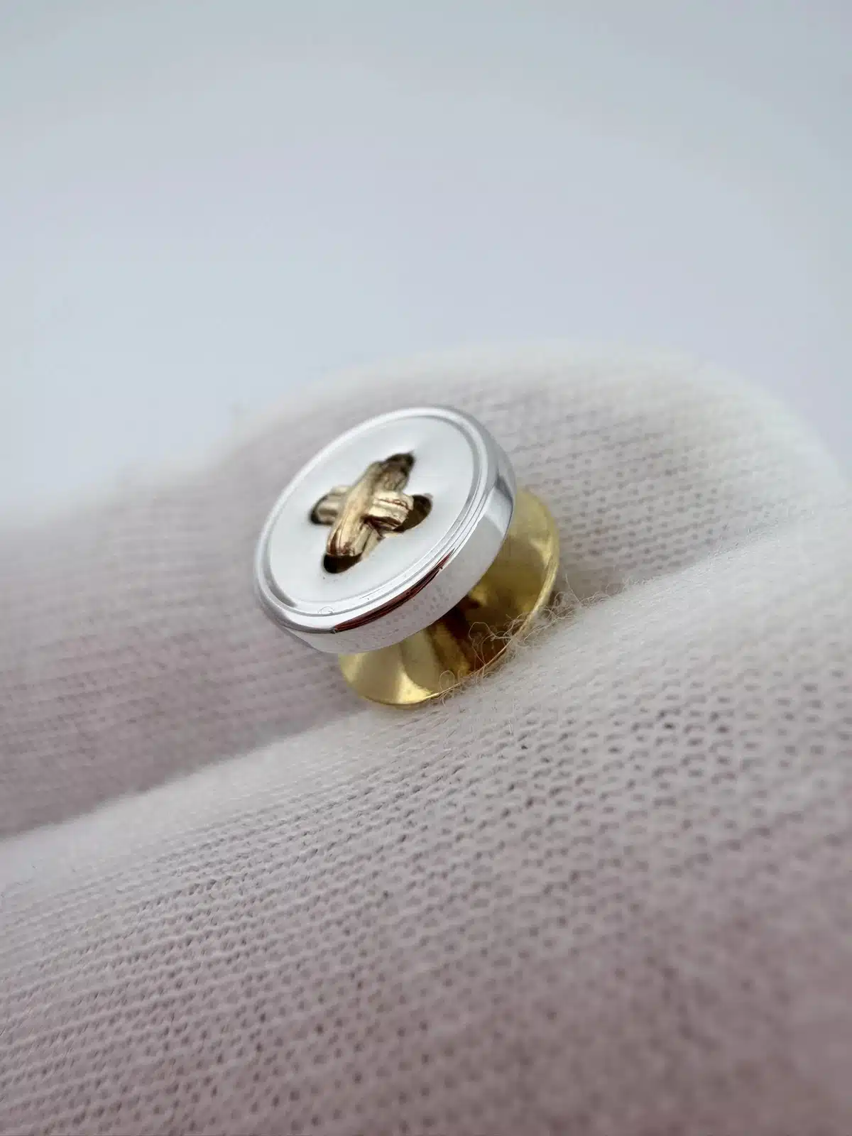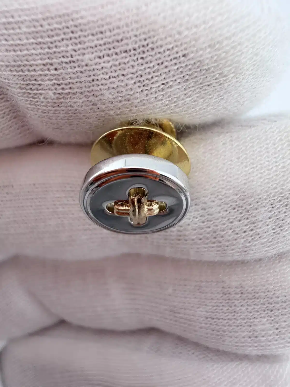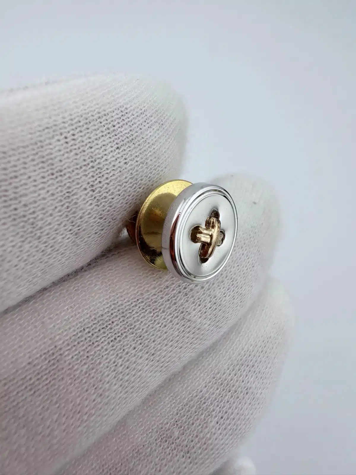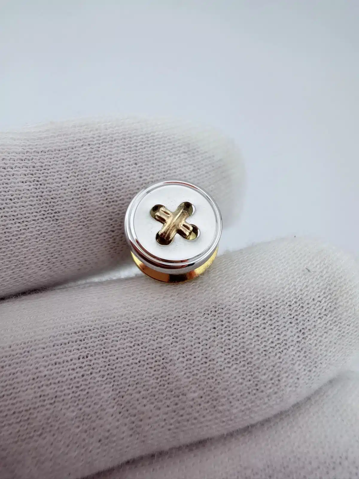 This sewing button tie tack pin features a 3/8 inch sterling silver button design accented with 14K gold thread set within the button’s four tiny holes, mimicking the look of real thread sewn through a classic four-hole button.