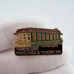 Beneath the train, the pin reads “White Pass & Yukon RR,” tying the piece directly to the famed narrow-gauge railroad that has operated through Alaska and Canada since the Klondike Gold Rush era.