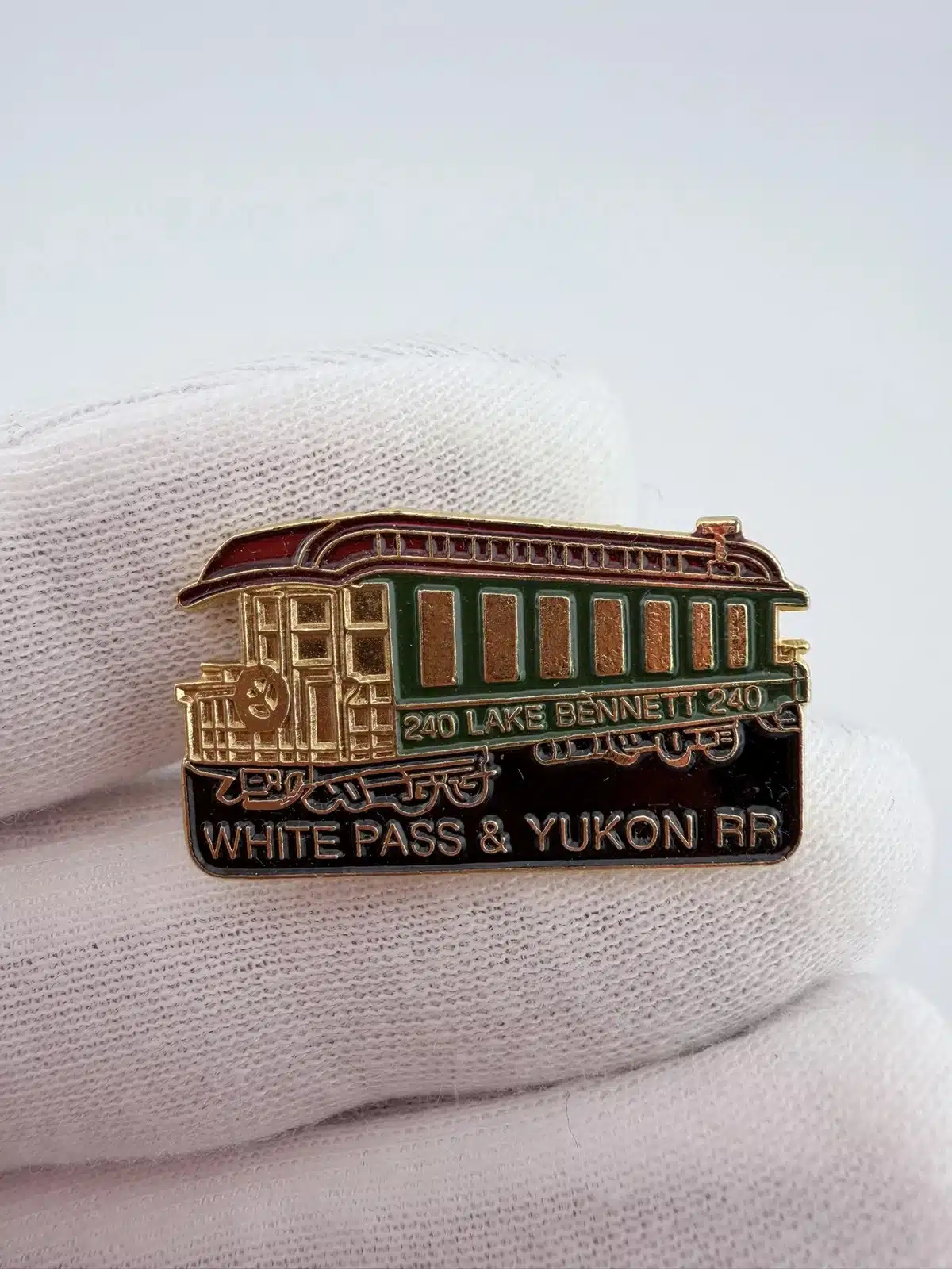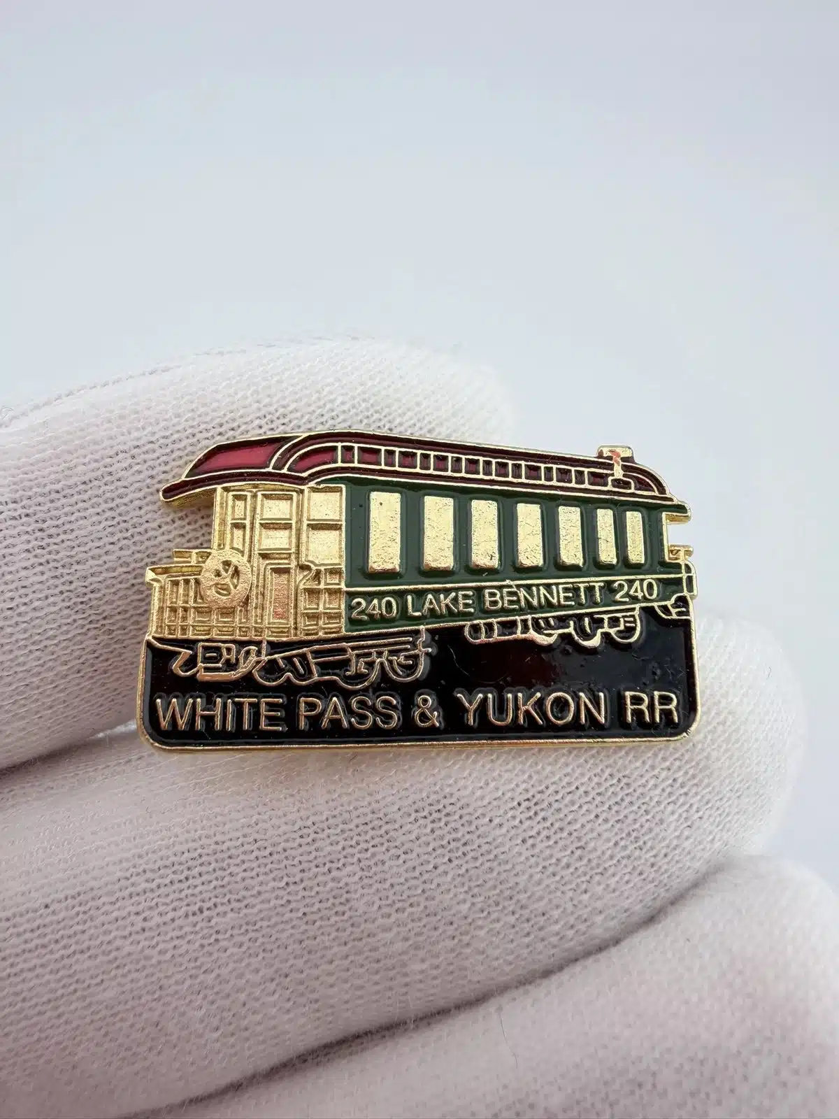Beneath the train, the pin reads “White Pass & Yukon RR,” tying the piece directly to the famed narrow-gauge railroad that has operated through Alaska and Canada since the Klondike Gold Rush era.