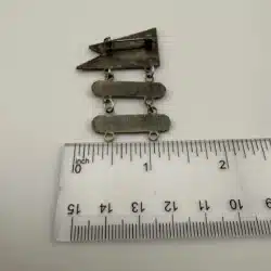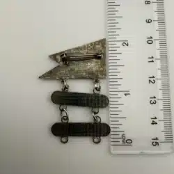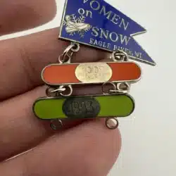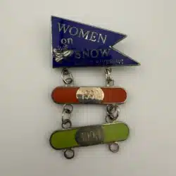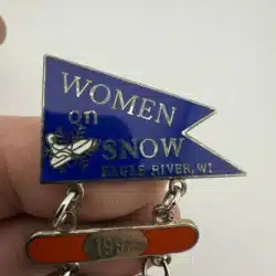 This pin is from the Women On Snow event which is held annually in Eagle River, Wisconsin. The top pin features a snowmobiler in front of a snowflake along with the name of the event and location. Below hang 2 pill shaped dangles showing the years of attendance.