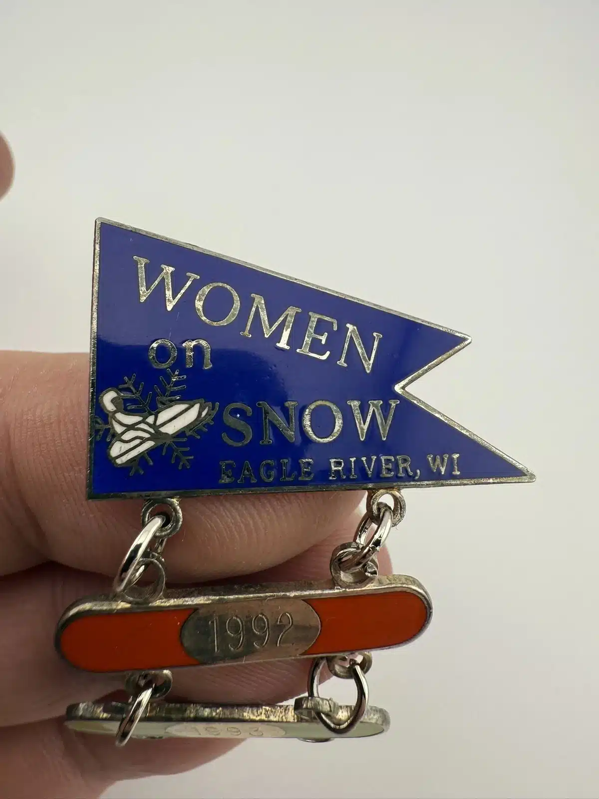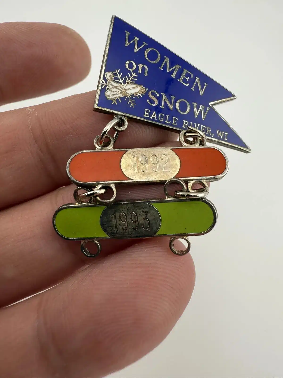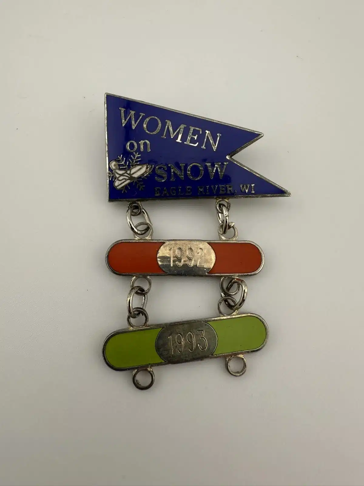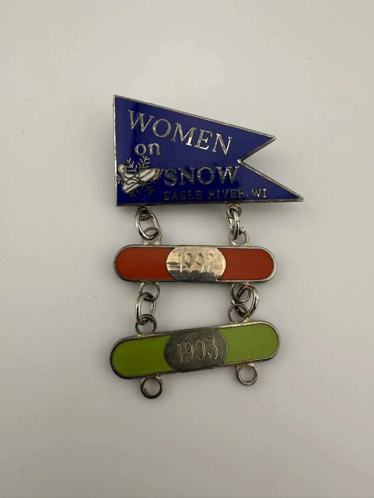 This pin is from the Women On Snow event which is held annually in Eagle River, Wisconsin. The top pin features a snowmobiler in front of a snowflake along with the name of the event and location. Below hang 2 pill shaped dangles showing the years of attendance.