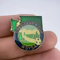 This pin features the emblem of the Washington State Youth Soccer Association, prominently displaying the tournament name ‘Presidents Cup’ in bold lettering. The design celebrates the annual youth soccer competition, highlighting the spirit of teamwork and sportsmanship in the state of Washington.