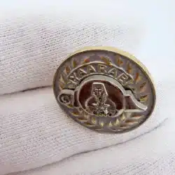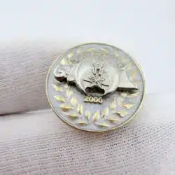 This Yaarab Shriners 2000 Jewel Of The Order lapel pin features a silver tone base with gold tone lettering spelling ‘YARAAB’ at the top, showcasing the emblem of the Jewel Of The Order in the center. The design is completed with the year ‘2000’ below the emblem, all elegantly encircled by a laurel wreath, symbolizing honor and achievement.