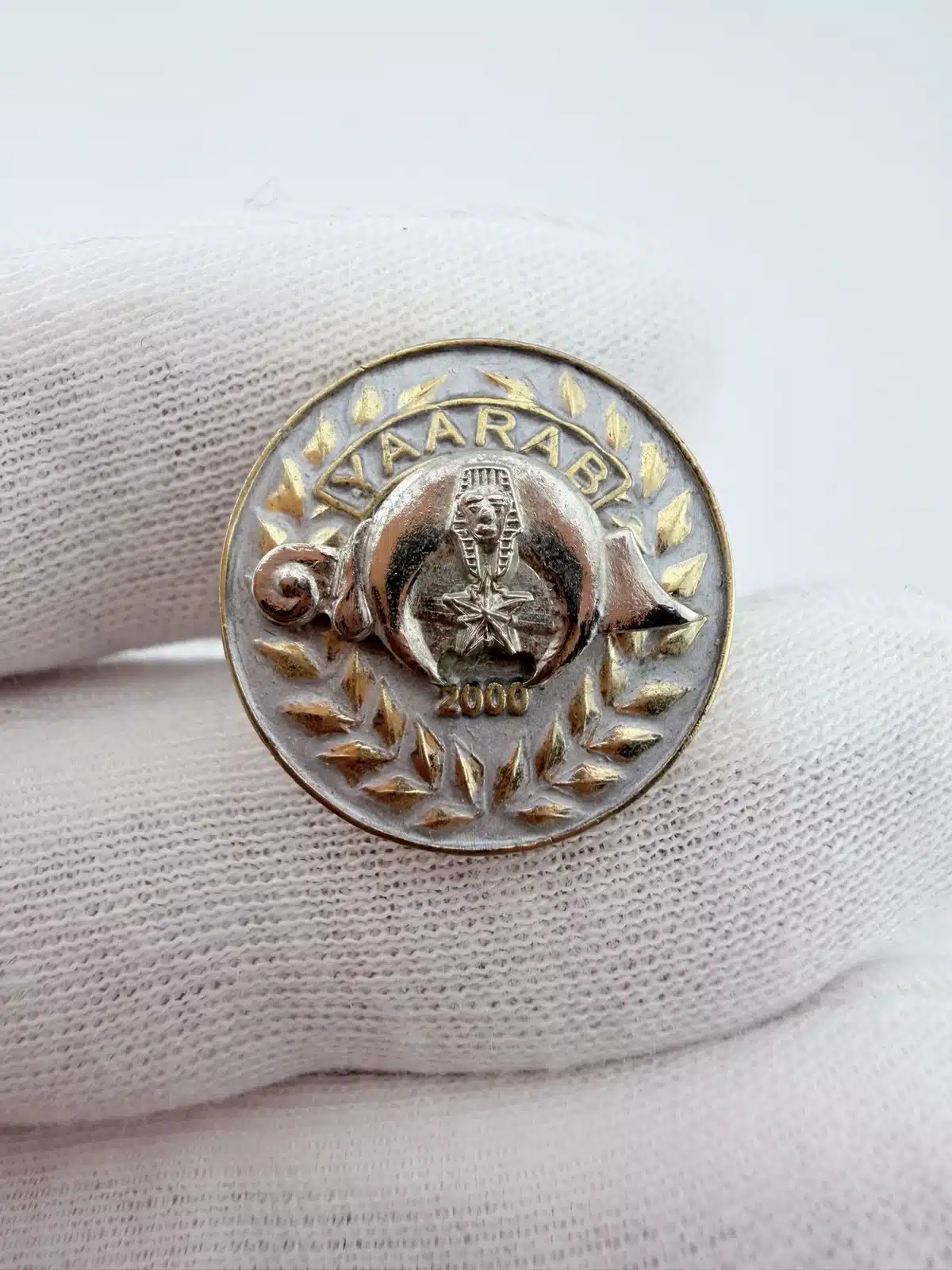 This Yaarab Shriners 2000 Jewel Of The Order lapel pin features a silver tone base with gold tone lettering spelling ‘YARAAB’ at the top, showcasing the emblem of the Jewel Of The Order in the center. The design is completed with the year ‘2000’ below the emblem, all elegantly encircled by a laurel wreath, symbolizing honor and achievement.
