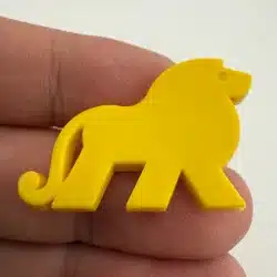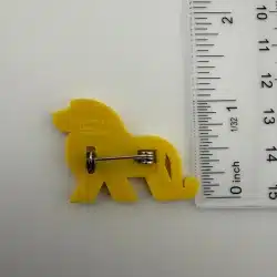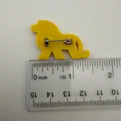 This Yellow Lion Plastic Pin, by Dart Industries Inc., features a simplified outline design, showcasing the iconic form of a lion in a bright yellow hue.