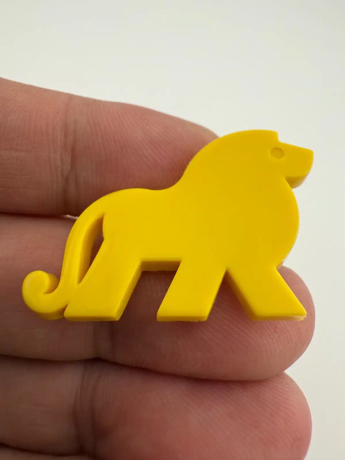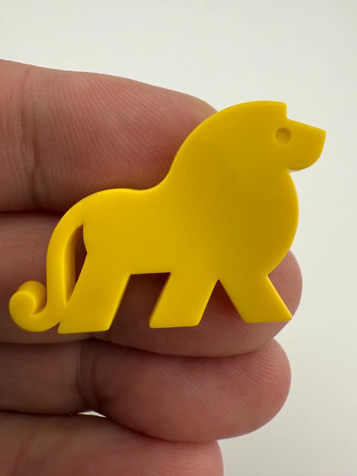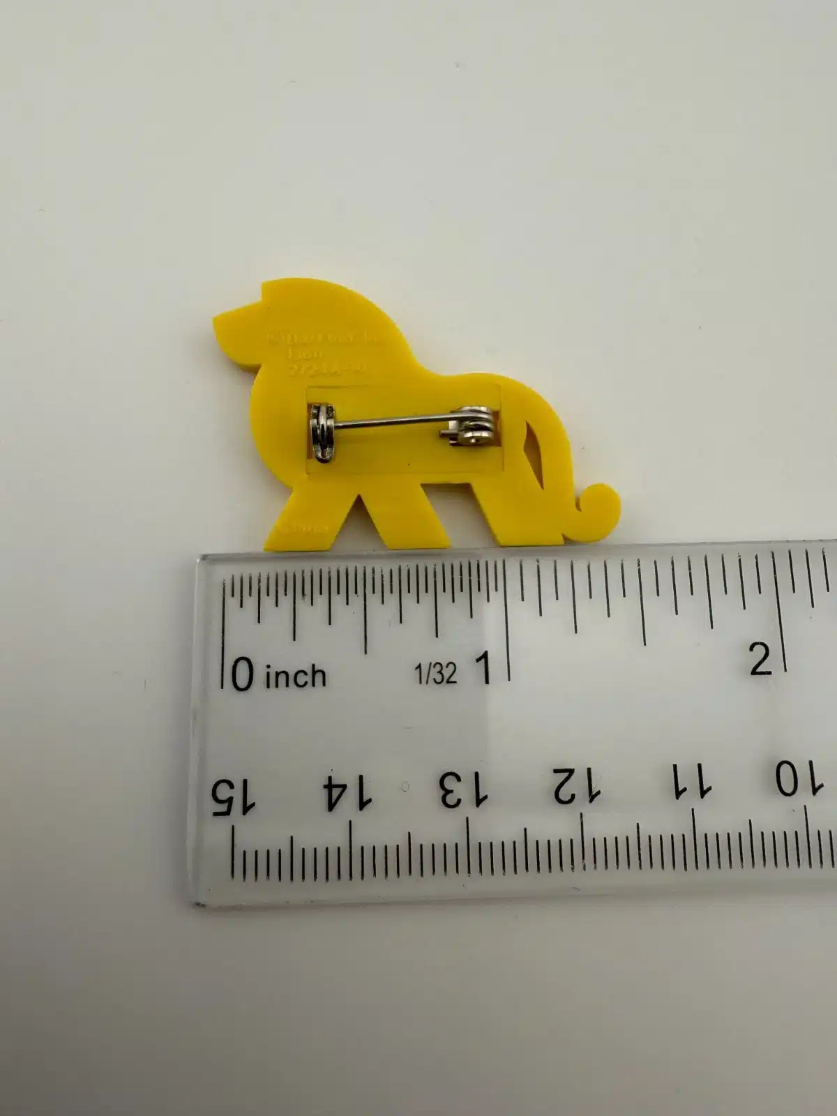 This Yellow Lion Plastic Pin, by Dart Industries Inc., features a simplified outline design, showcasing the iconic form of a lion in a bright yellow hue.